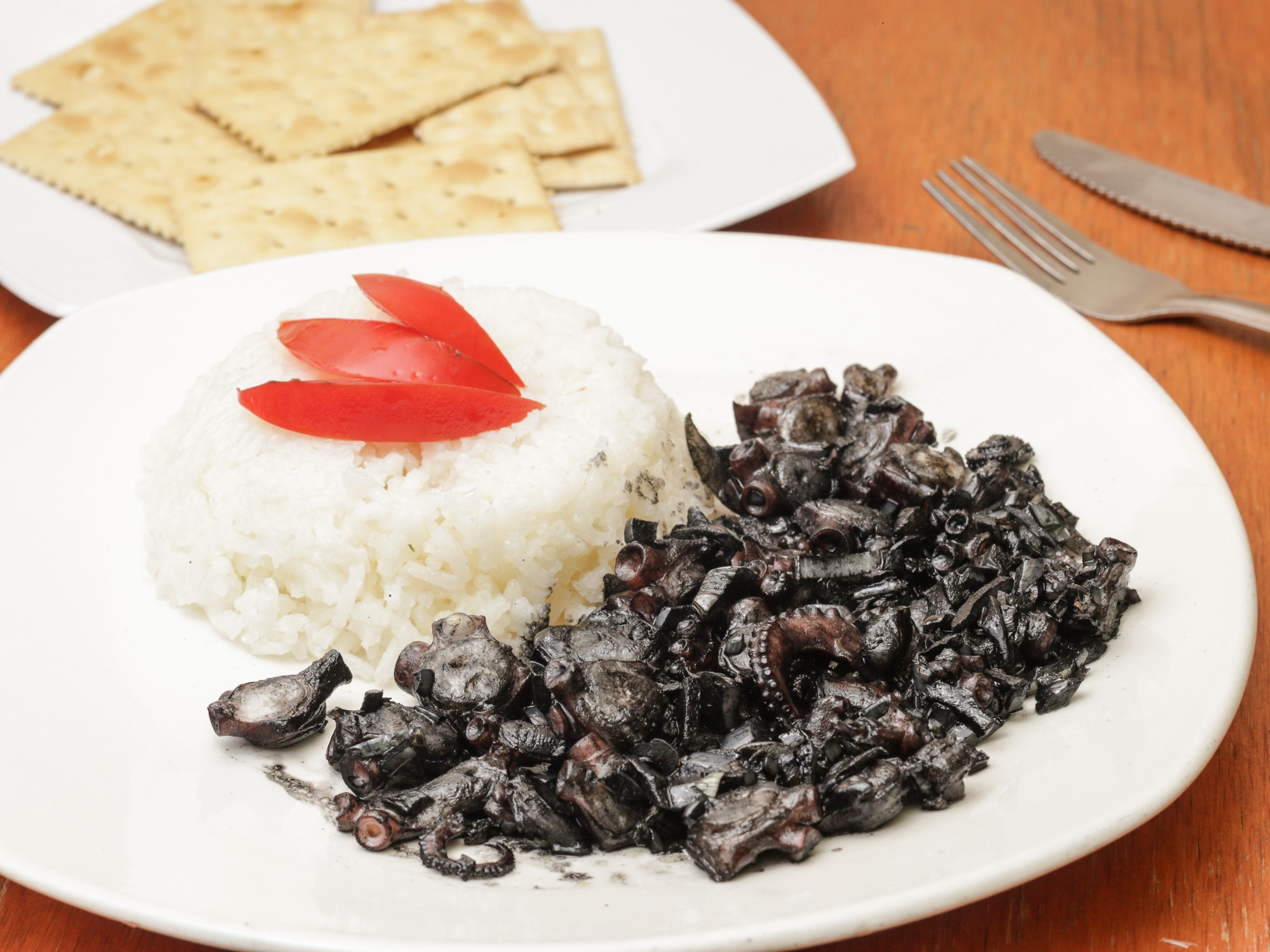 Trozos de pulpo fresco recién cortados guisados con su misma tinta. Servidos con orden de arroz.
