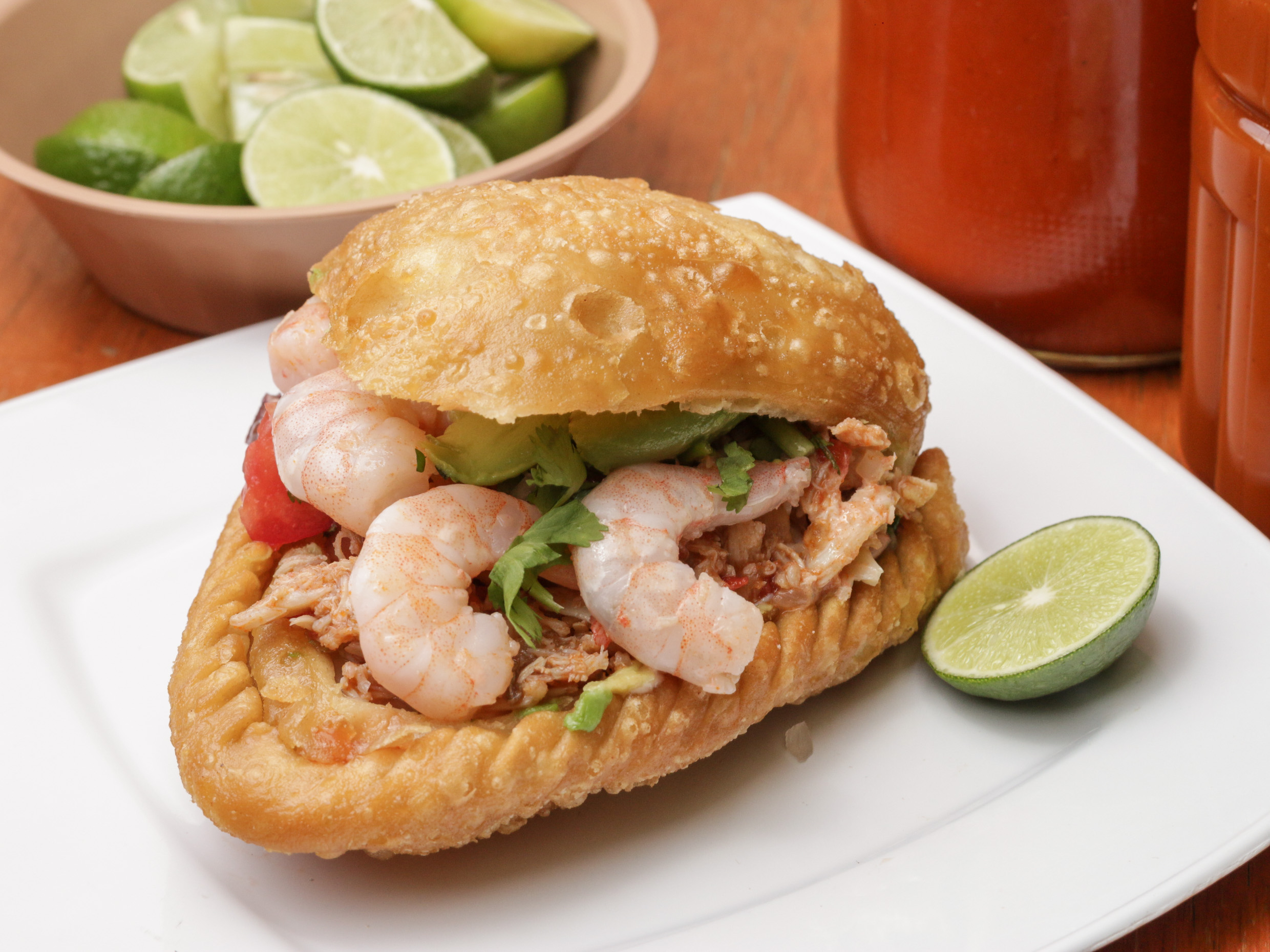 Empanada de camarón servida con cátsup, mayonesa y aguacate. + Limon