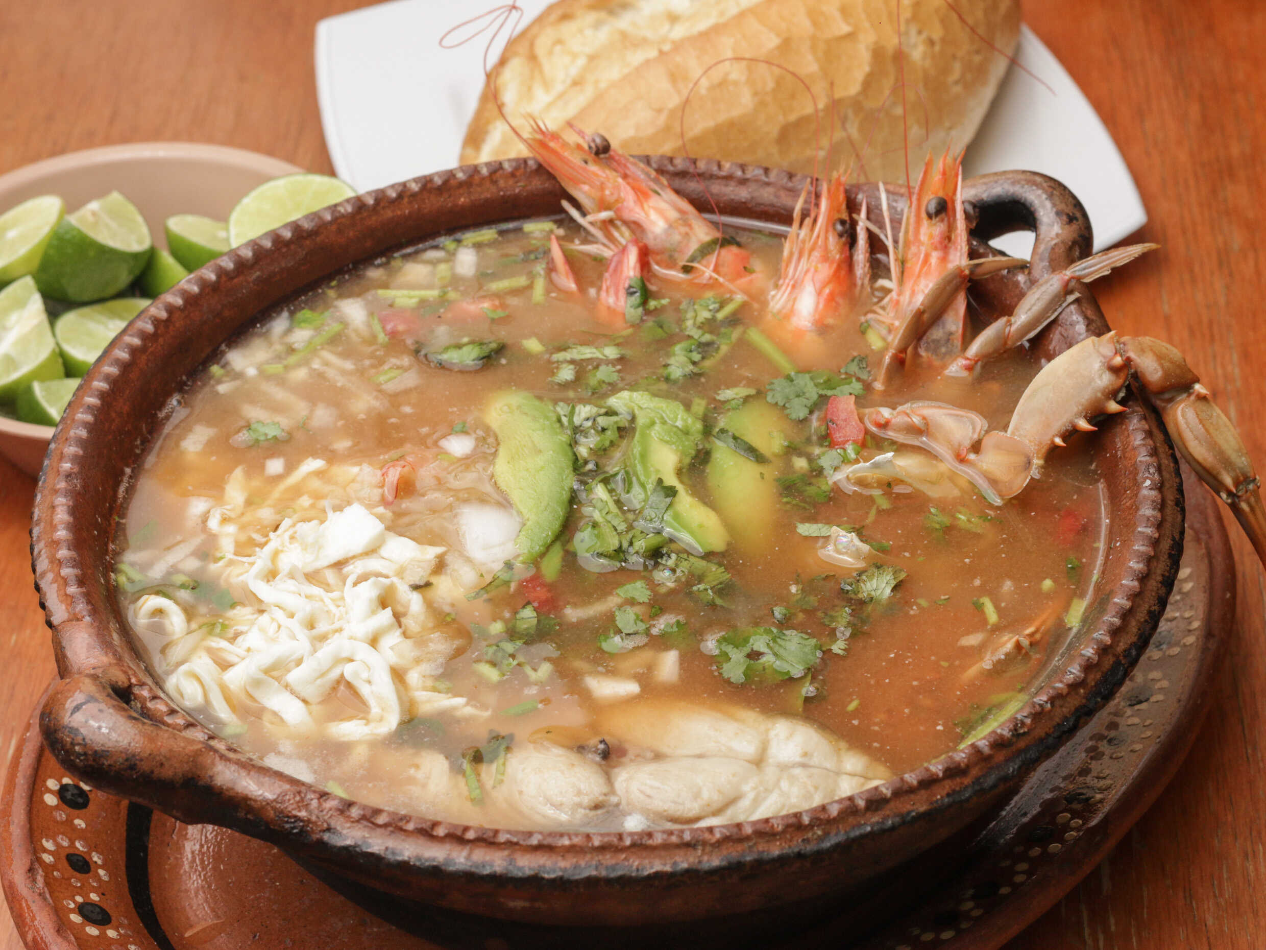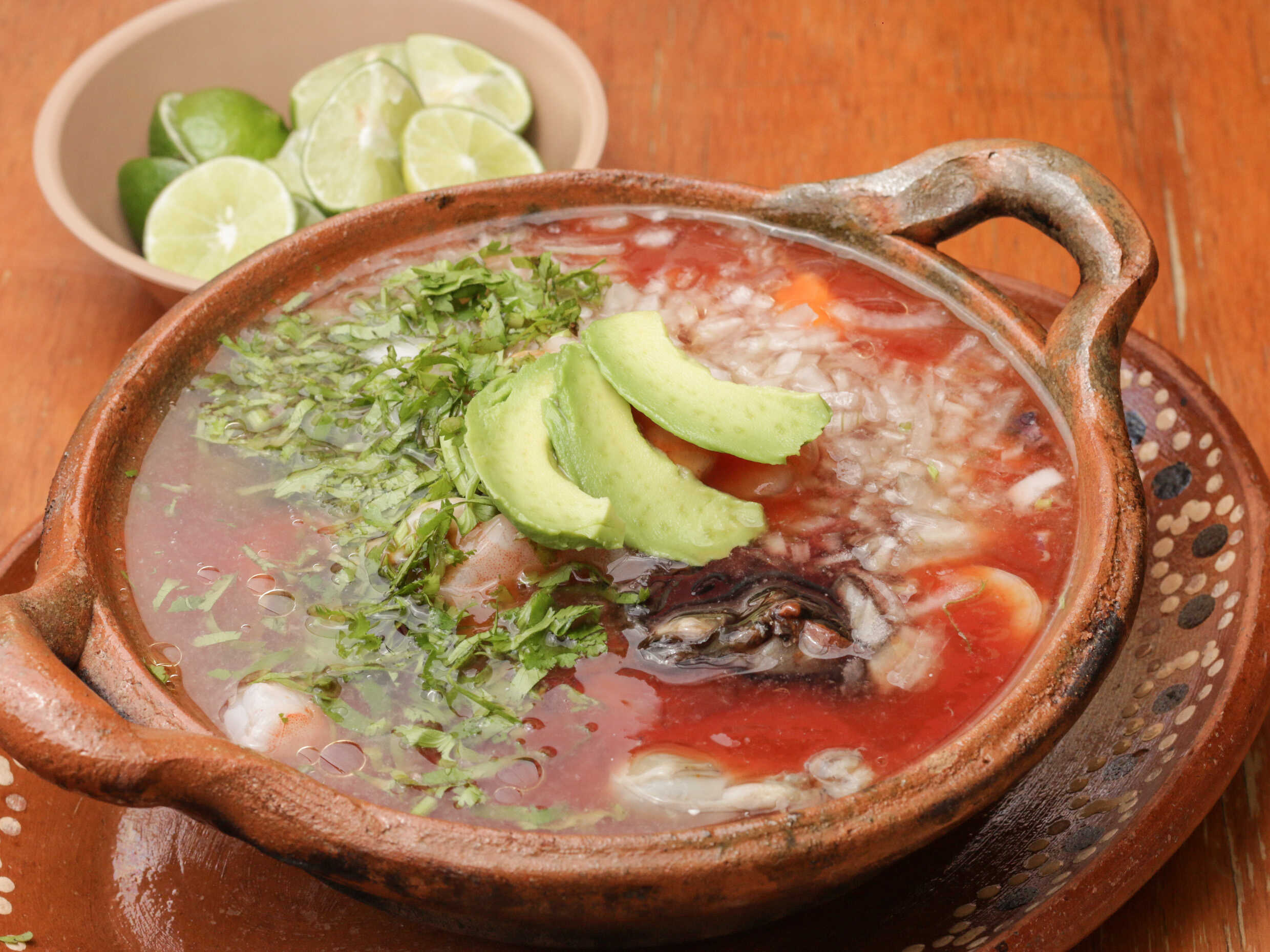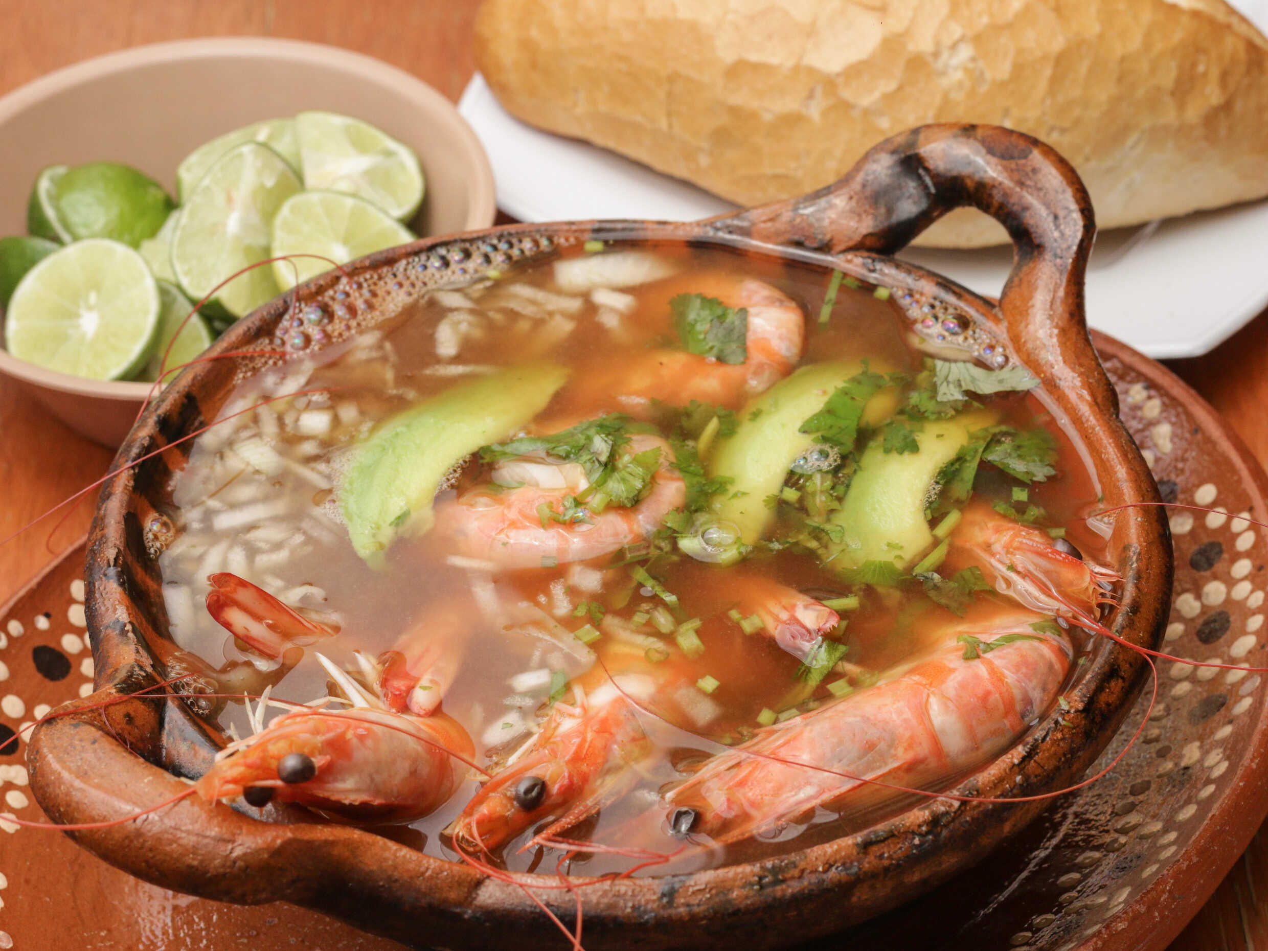 Delicioso caldo de camarón servido con almejas, papa, zanahoria, cilantro, cebolla y aguacate.