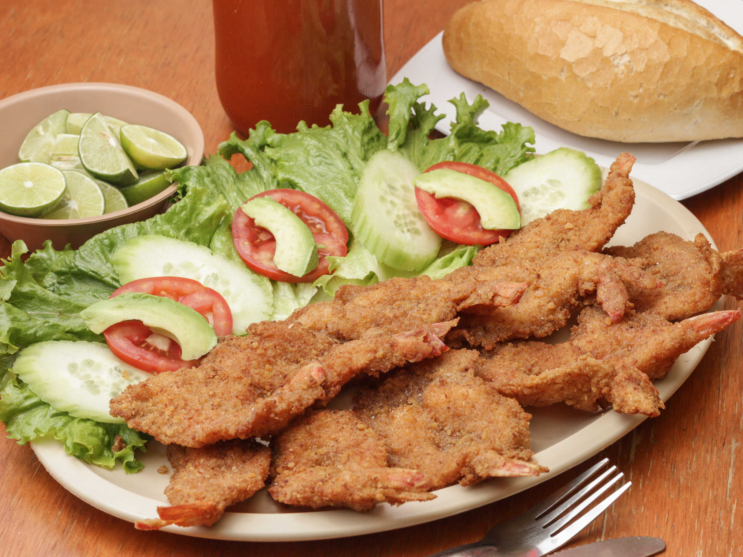 12 camarones grandes empanizados fritos. Servidos con ensalada de lechuga fresca, pepino, jitomate y aguacate.