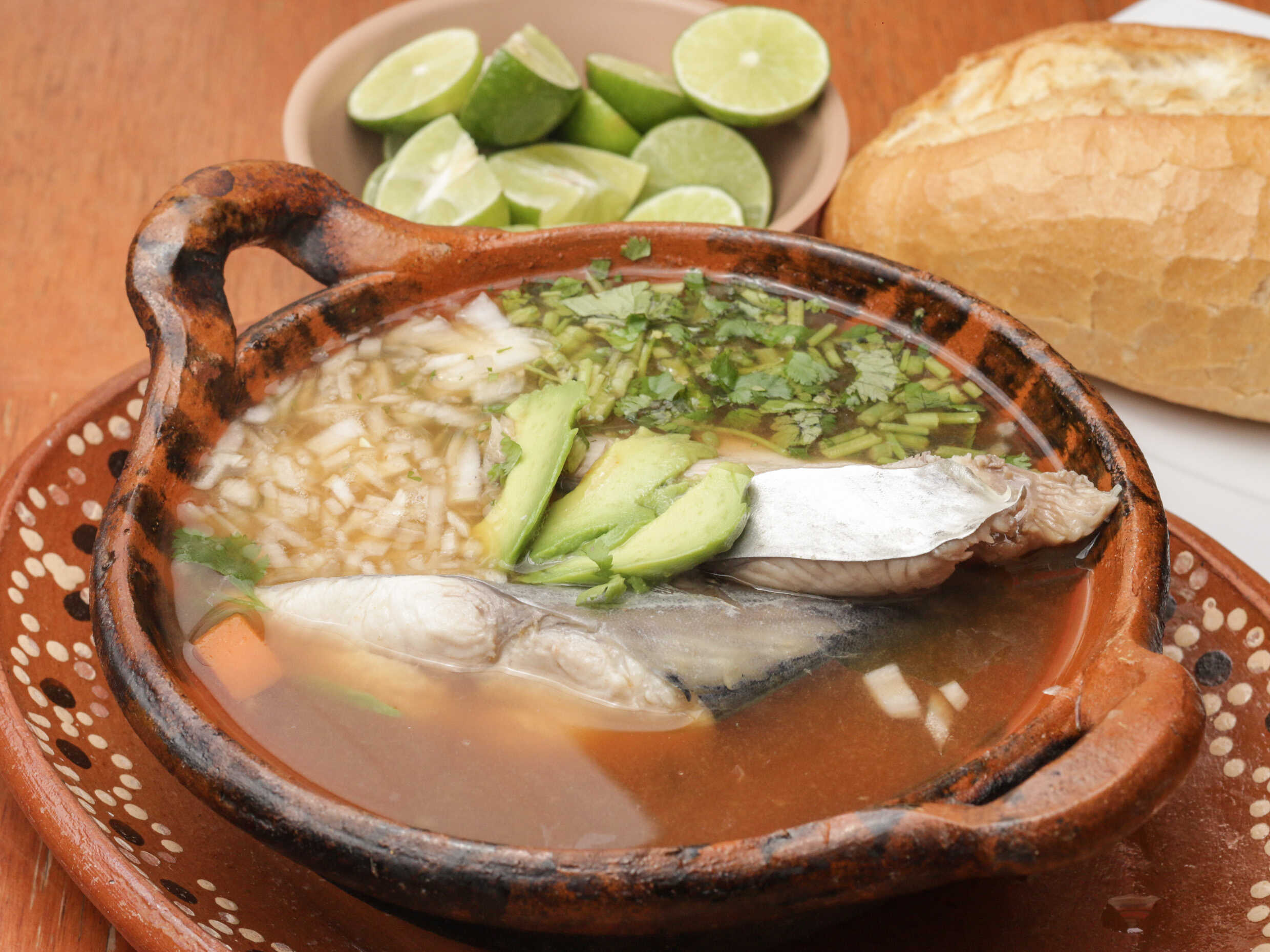 Delicioso caldo de pescado servido con almejas, papa, zanahoria, cilantro, cebolla y aguacate.