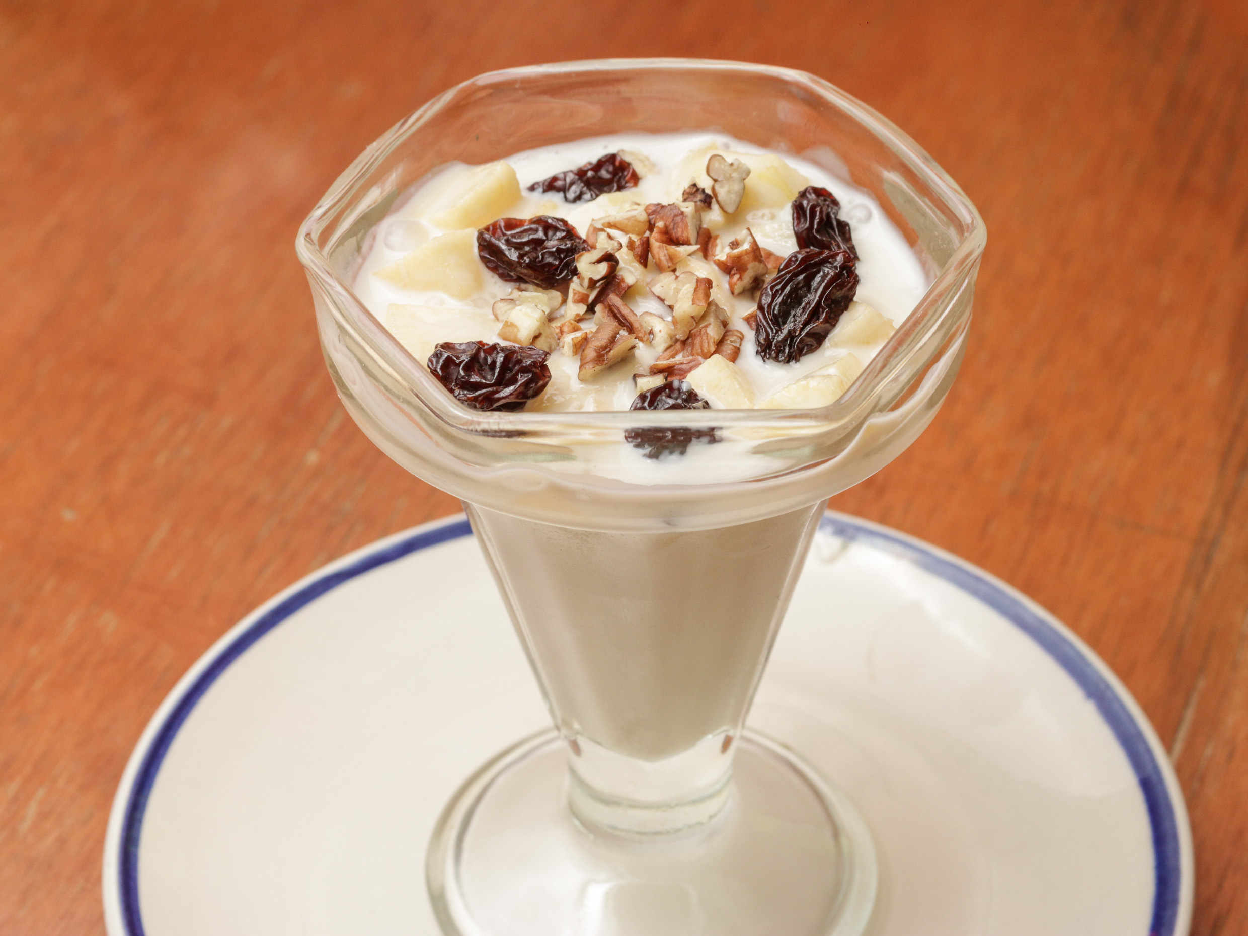 45 gramos de manzanas con crema acompañado con pasas y nuez