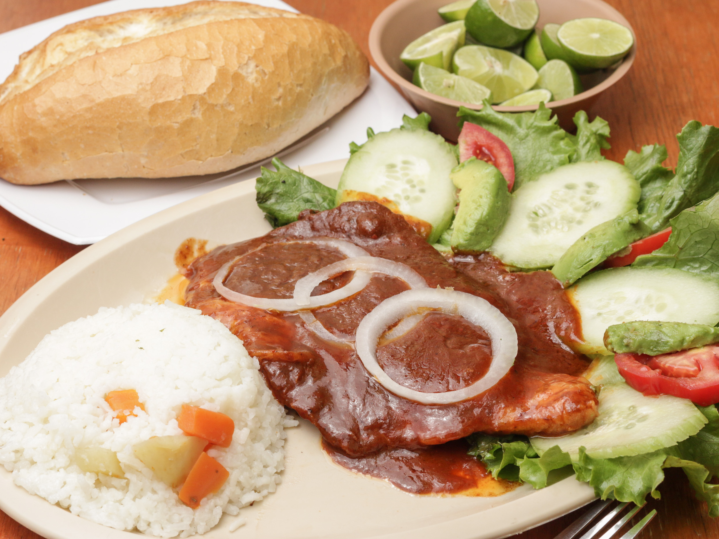 Sabana de pescado sazonada con salsa chipotle. Servidos con ensalada de lechuga fresca, pepino, jitomate y aguacate. Se agrega orden de arroz.