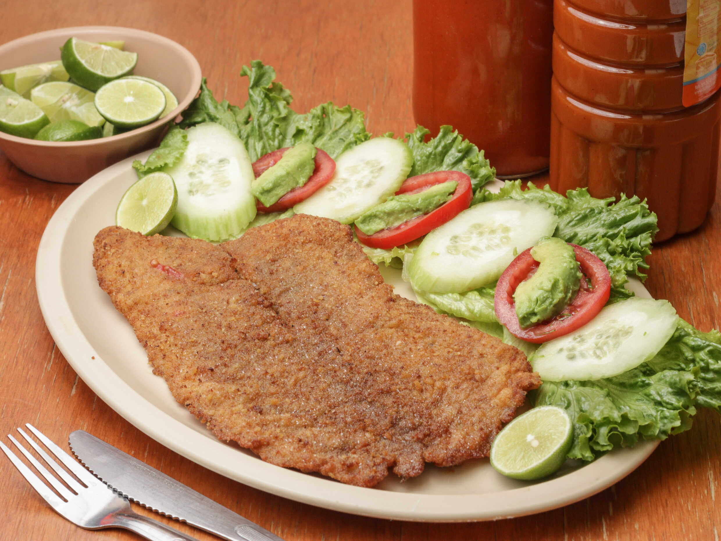 Sábana de filete de pescado empanizado frita en aceite. Servidos con ensalada de lechuga fresca, pepino, jitomate y aguacate.