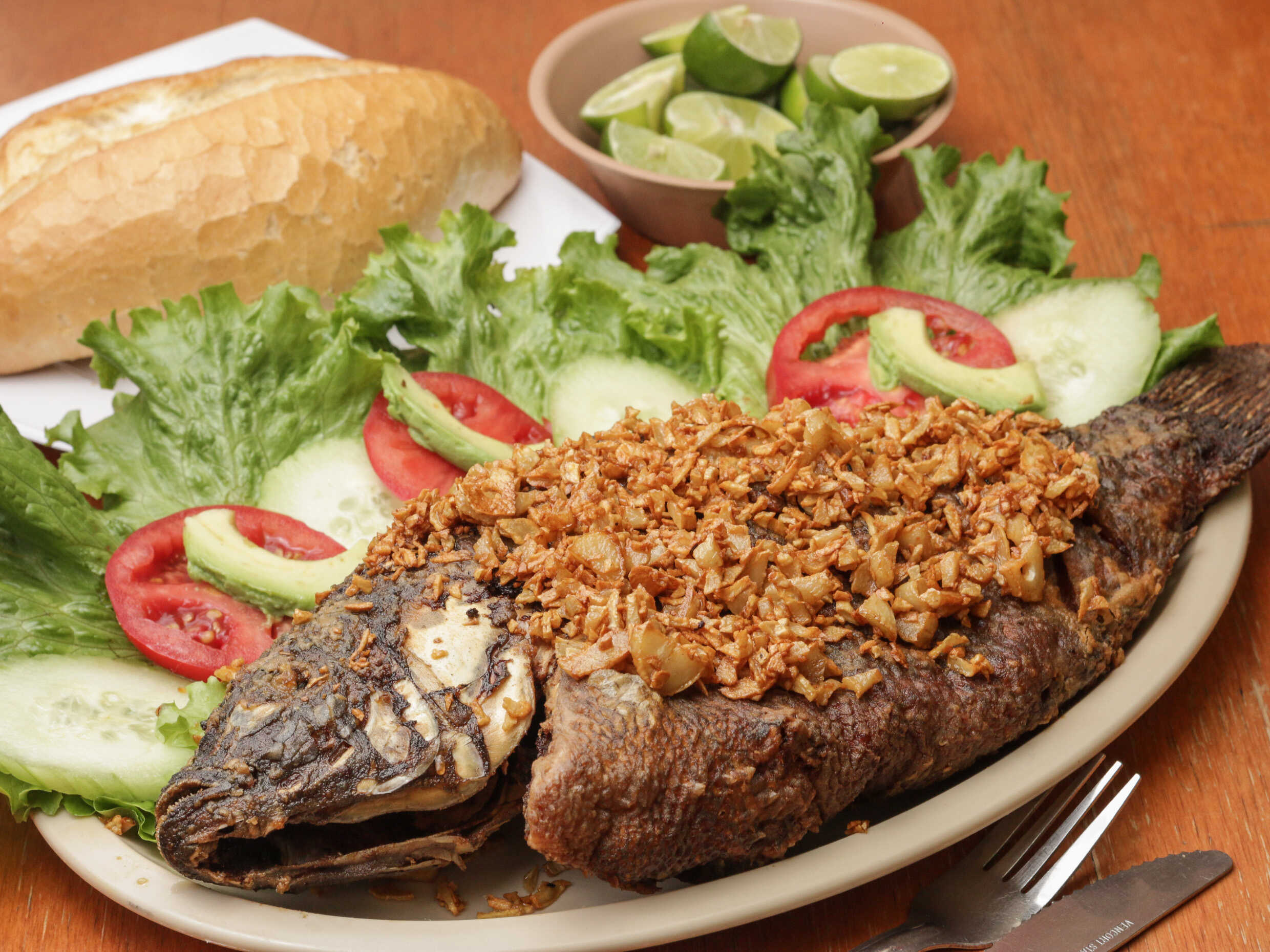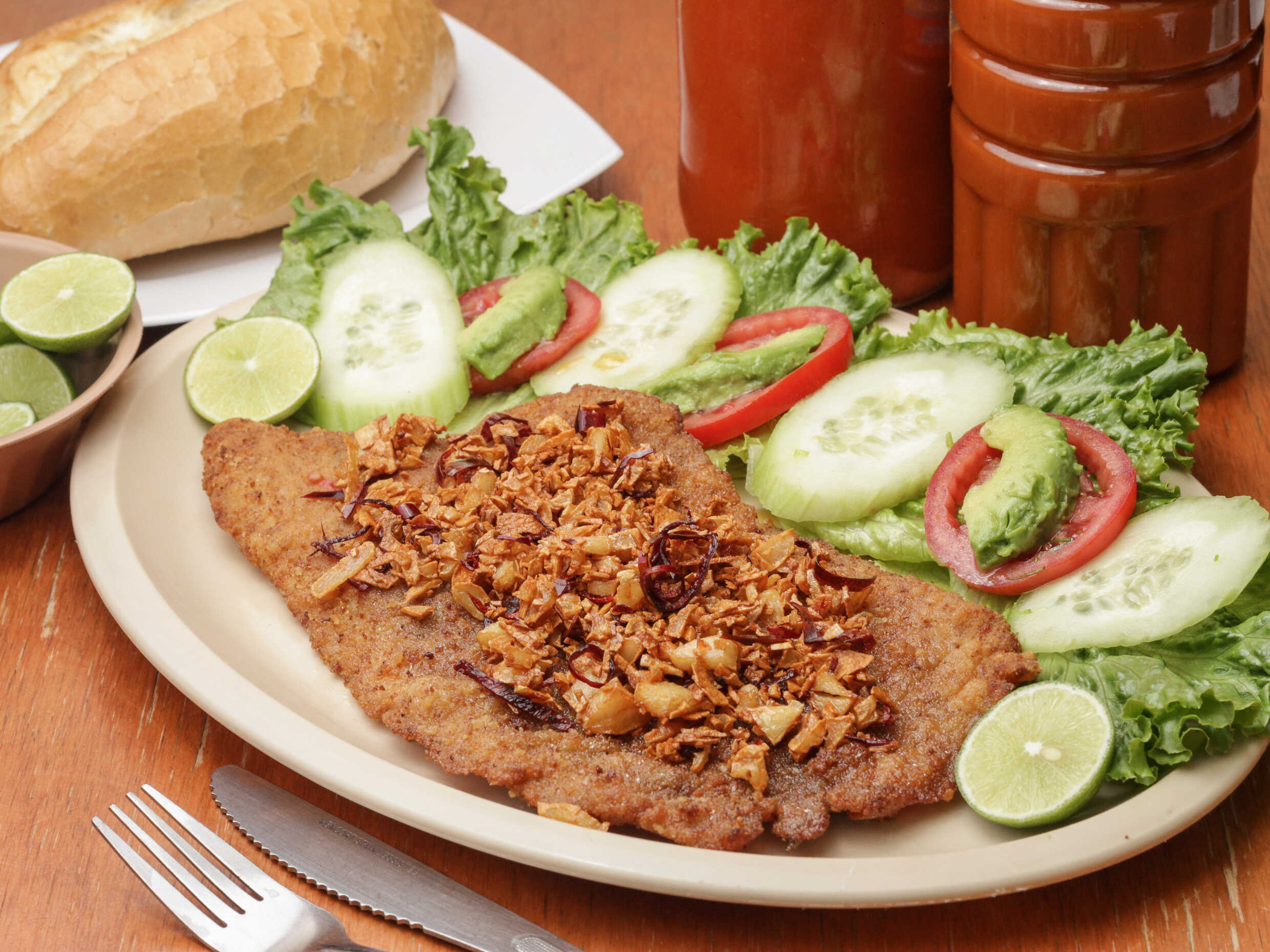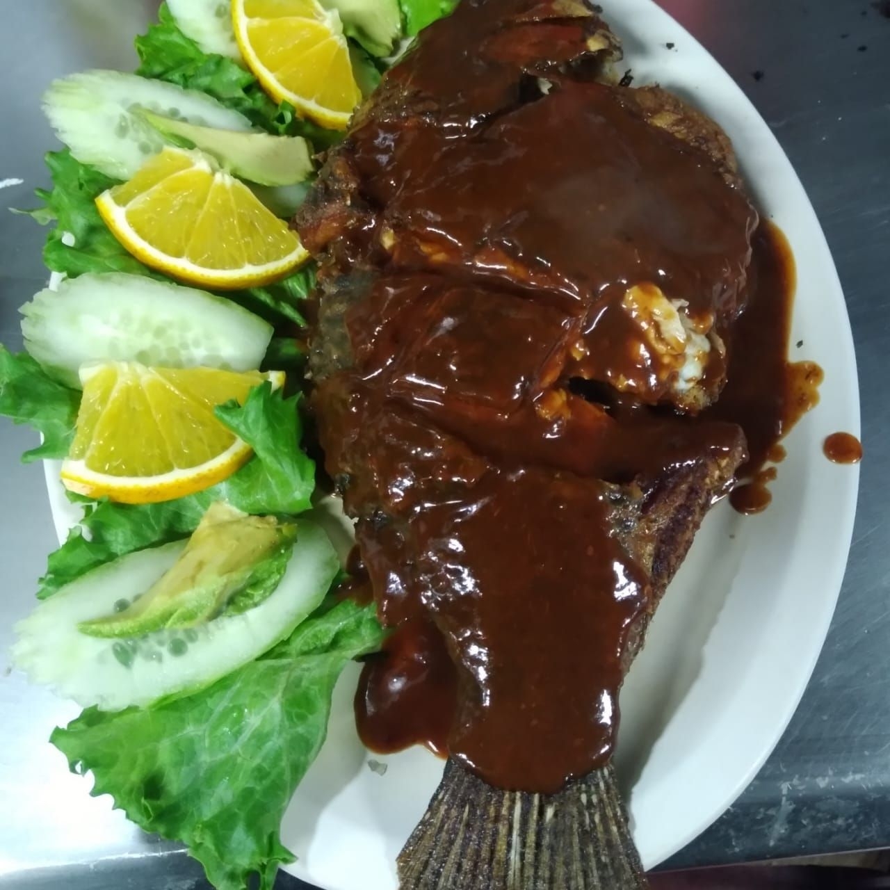 Sabana de filete de pescado empanizado y frito en aceite, bañado con ajos dorados y julianas de chile guajillo. Servidos con ensalada de lechuga fresca, pepino, jitomate y aguacate.