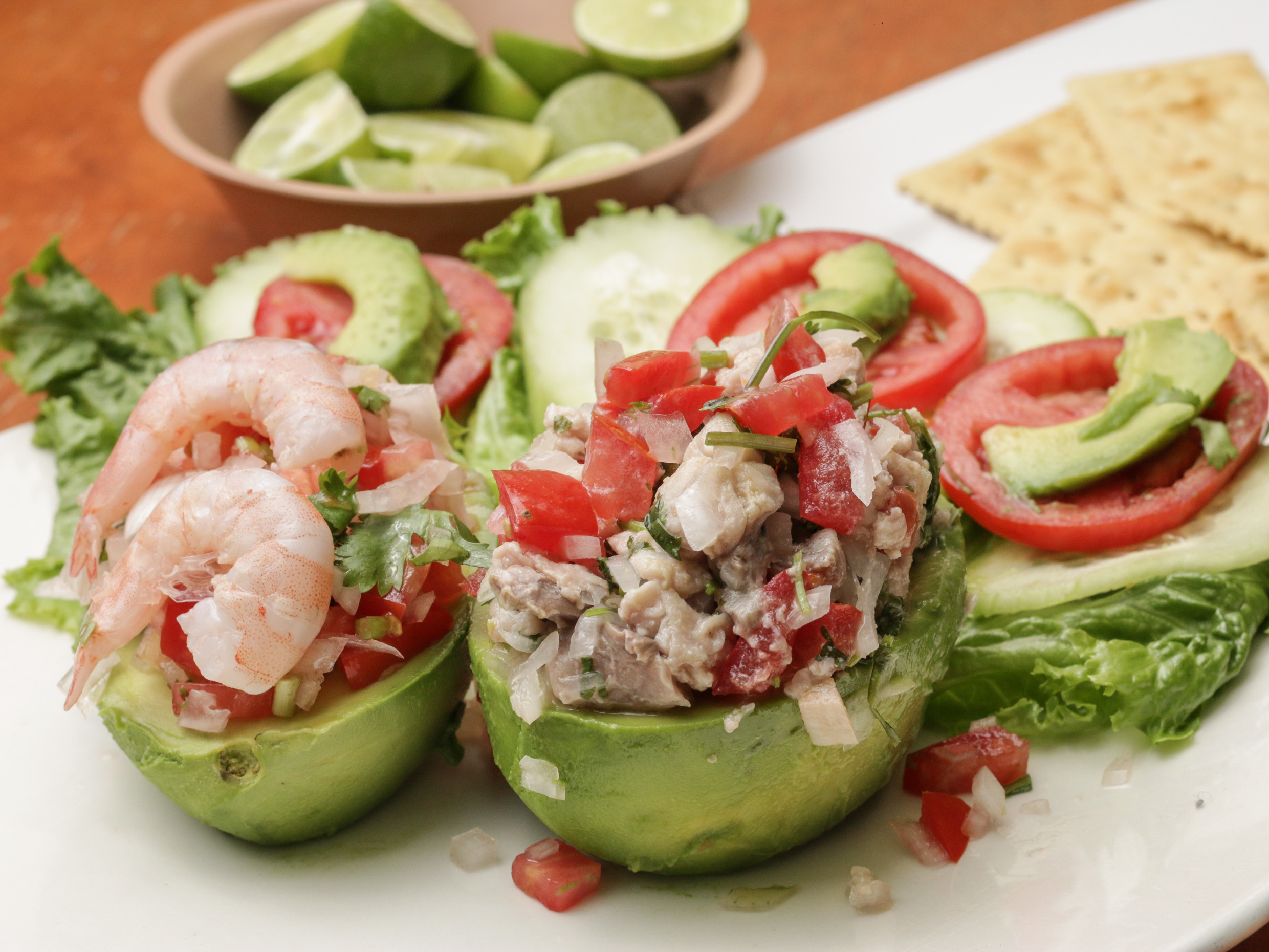 Pieza de aguacate grande partida a la mitad relleno de ceviche de camarón. Servidos con ensalada de lechuga fresca, pepino, jitomate y aguacate. Con aderezo de mayonesa.