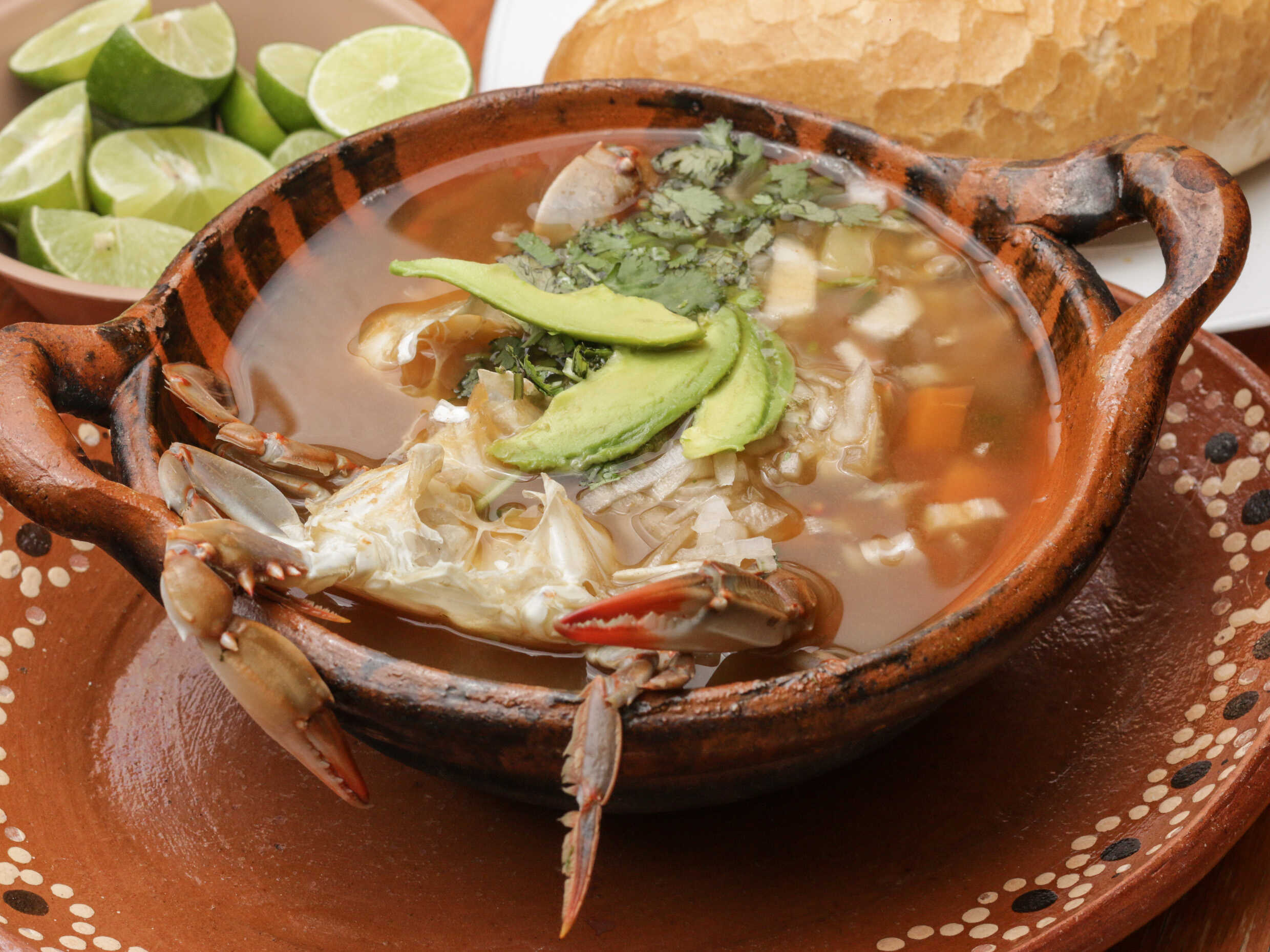 Delicioso caldo de jaiba servido con almejas, papa, zanahoria, cilantro, cebolla y aguacate.