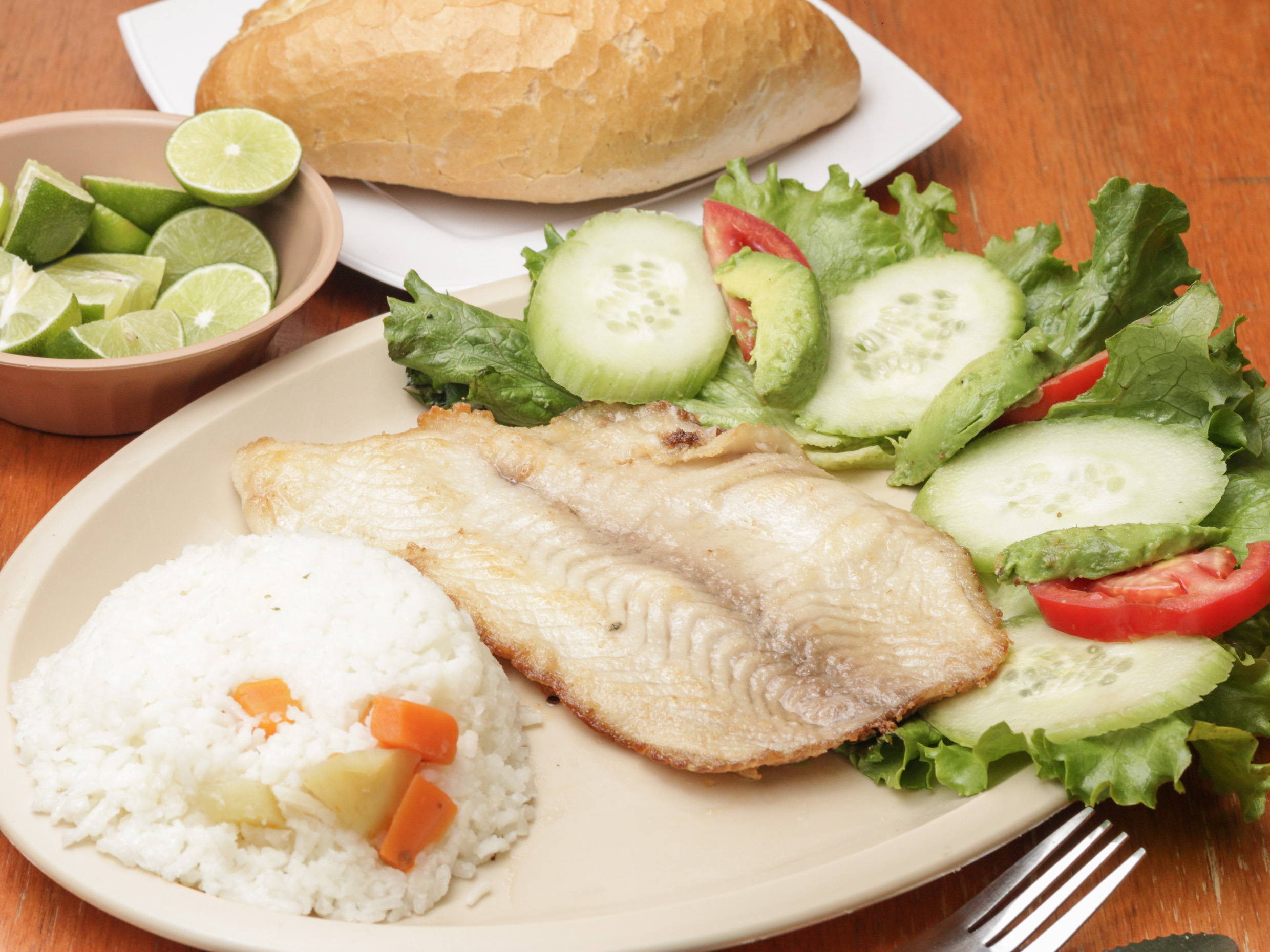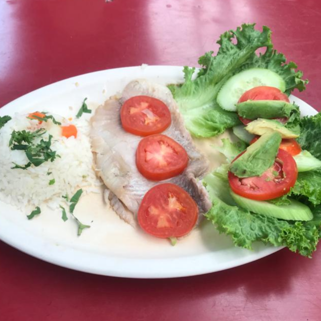 Sabana de filete de pescado cocido en sartén. Servidos con ensalada de lechuga fresca, pepino, jitomate y aguacate. Se agrega orden de arroz.