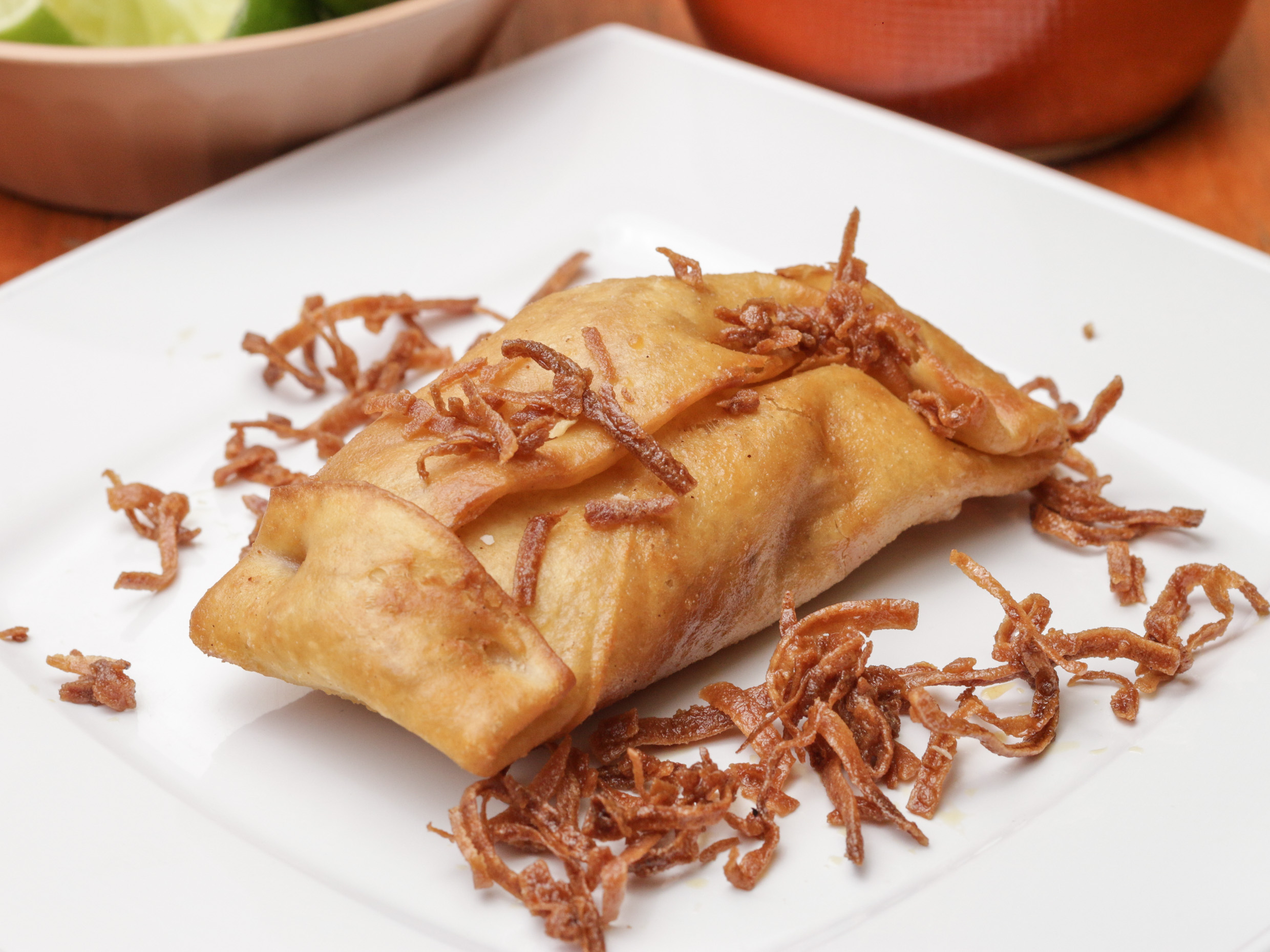Empanada hecha en casa, rellena de camarón, jaiba y pulpo. Servida con cátsup, mayonesa y aguacate.