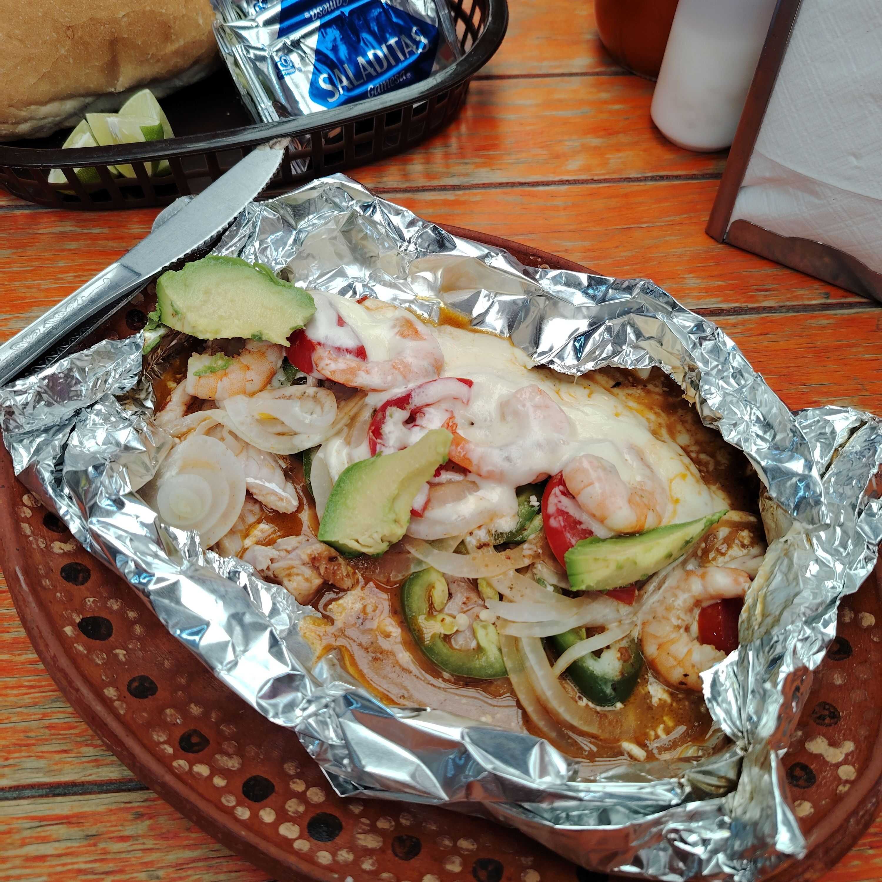 Sabana de pescado envuelta en papel aluminio con camarón, chile jalapeño, queso Oaxaca y un toque de salsa de chipotle con mayonesa.