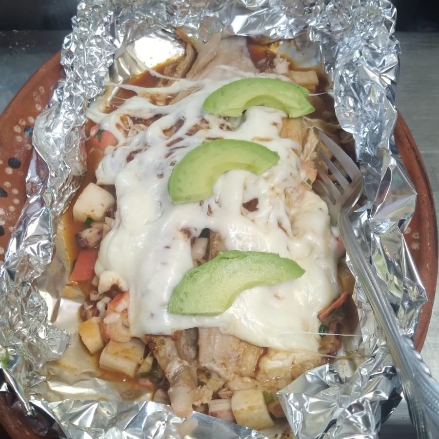 Mariscos frescos con filete de pescado gratinados con queso Oaxaca y envueltos en papel aluminio con un toque de salsa chipotle.