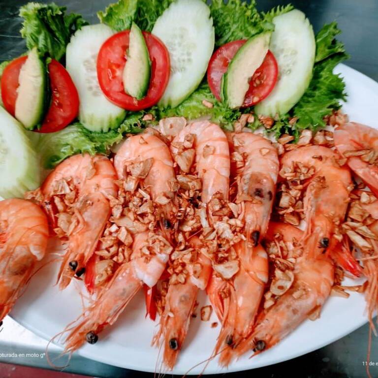12 camarones grandes con ajo y julianas de chile guajillo frito, acompañado con ensalada de lechuga, pepino, jitomate y aguacate
