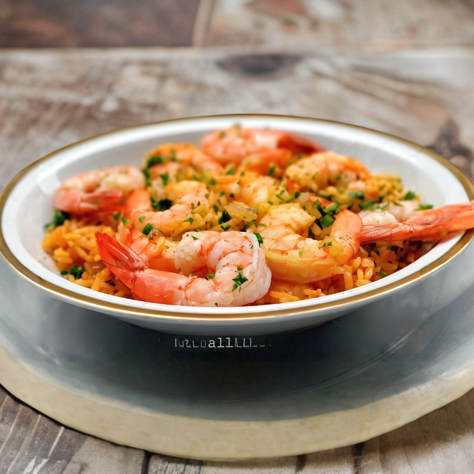 Orden de 250 gramos aproximadamente de camaron con cascara, acompañados de arroz.