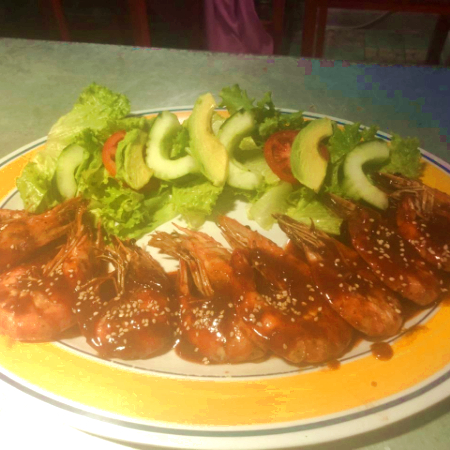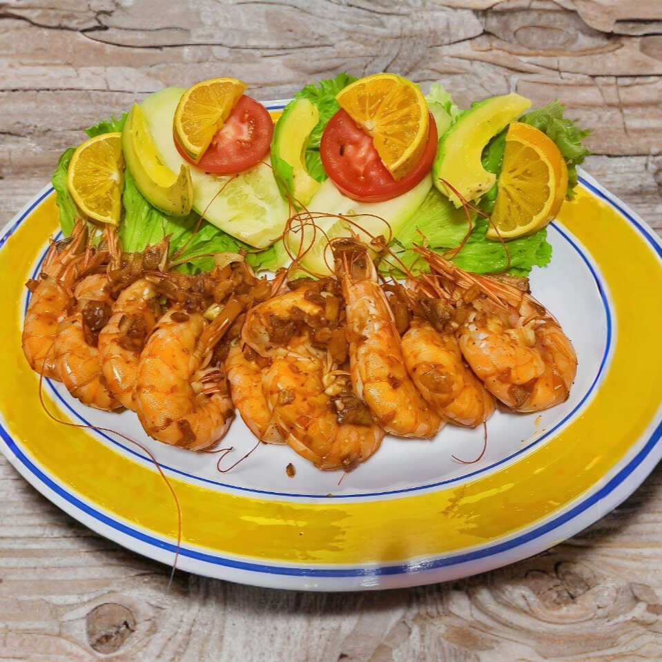 Orden de 250 gramos de camarón sin cascara a la plancha y sazonados, acompañados de ensalada de lechuga, jitomate, pepino y aguacate.