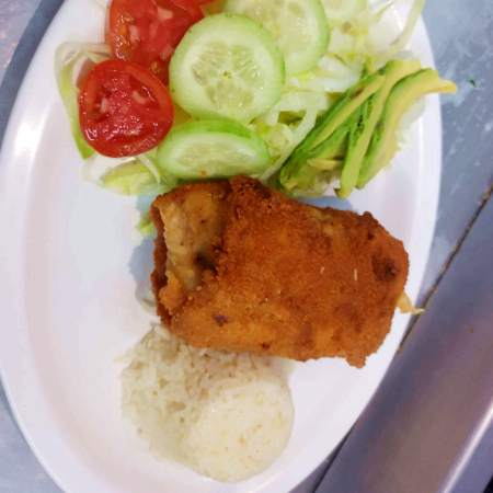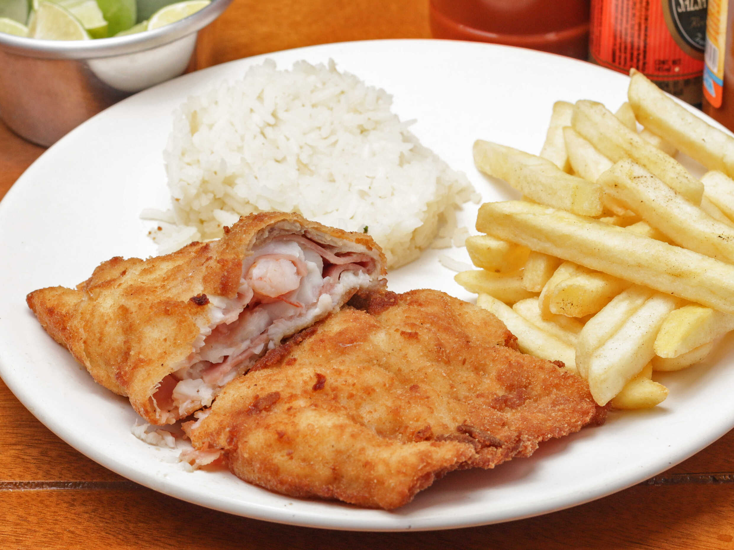 Filete empanizado relleno de jamon y queso gratinado, acompañado con ensalada y arroz.