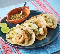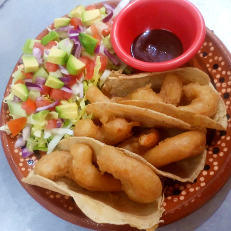 Orden de 3 tacos de camarón sin cascara con queso, en tortilla de harina, acompañados con ensalada picada de lechuga, jitomate, cebolla y aguacate.