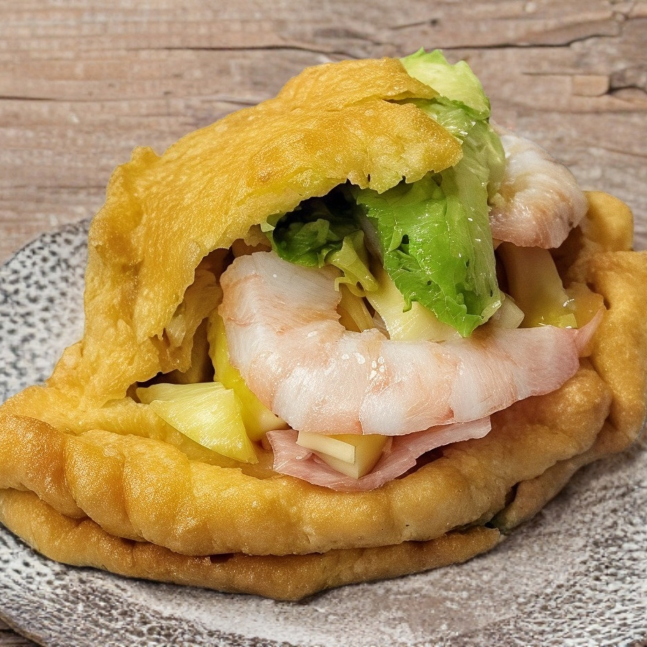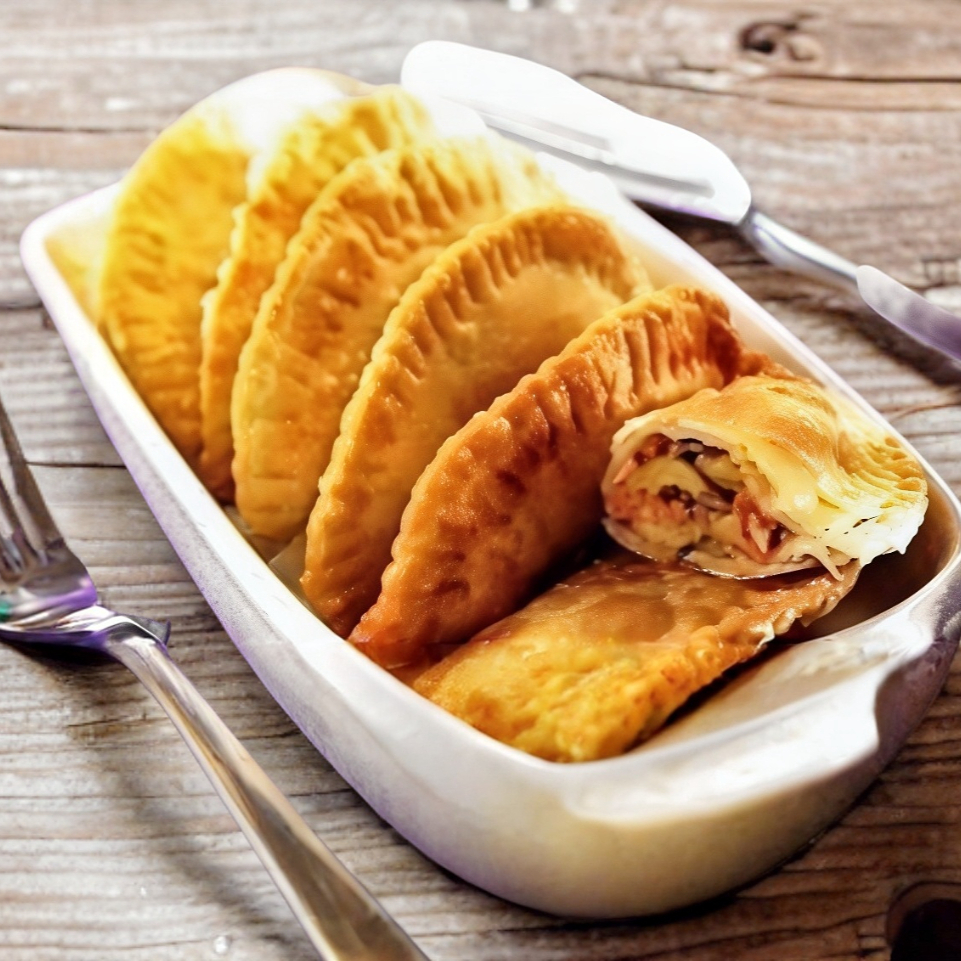 Empanada hecha en casa, con 75 gramos de camaron, jamon, queso, piña y aguacate.