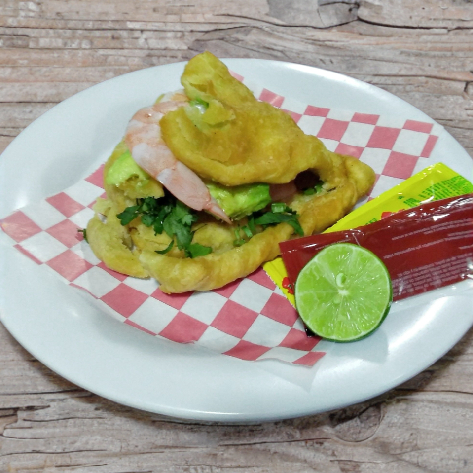 Una Empanada hecha en casa, con 75 gr de camarón, acompañada de cilantro, cebolla y aguacate (1pza)