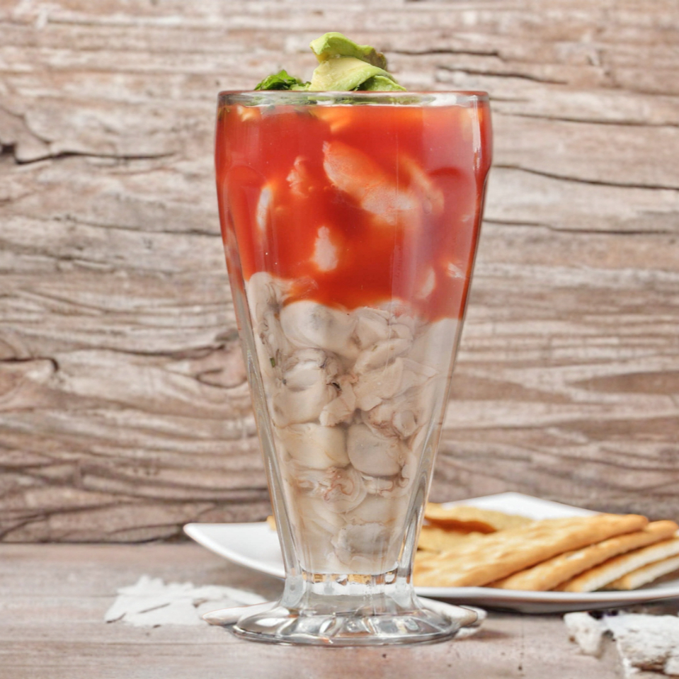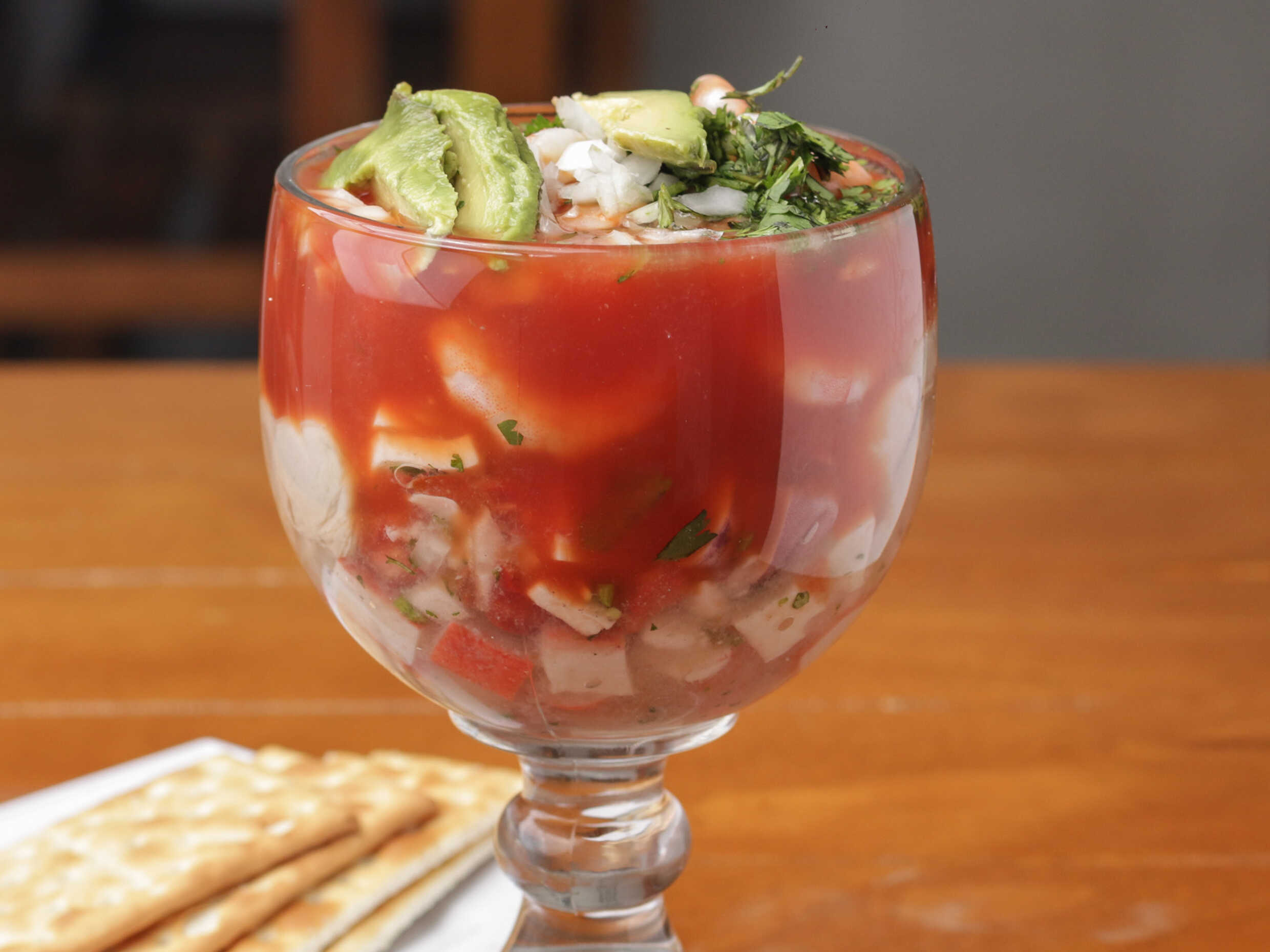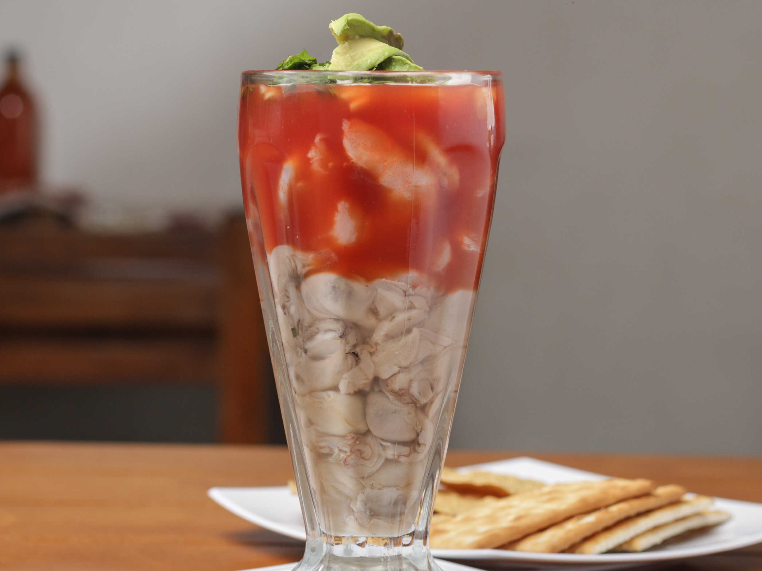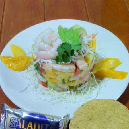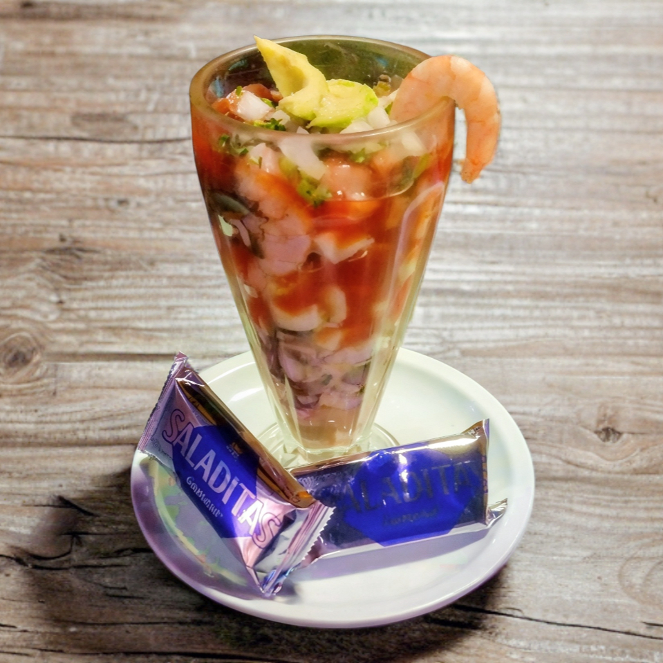 De camaron con ostion, con salsa catsup preparada, cilantro, cebolla y aguacate.