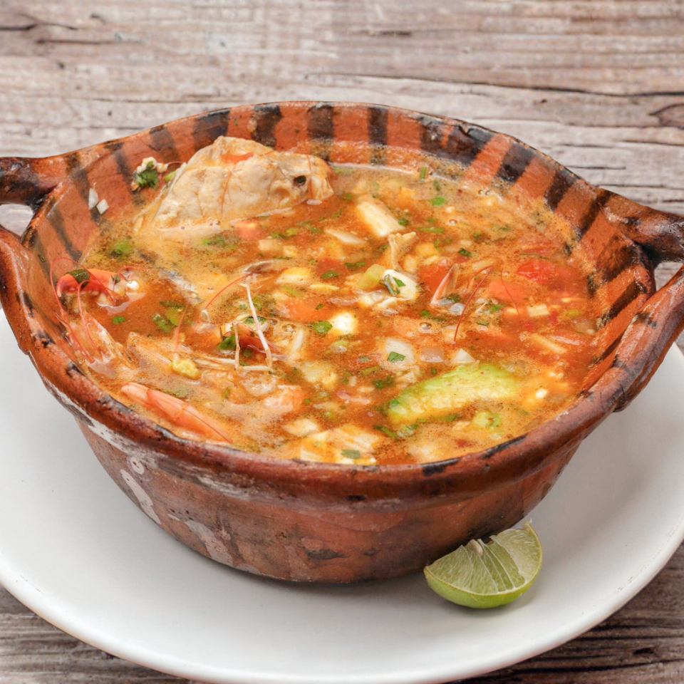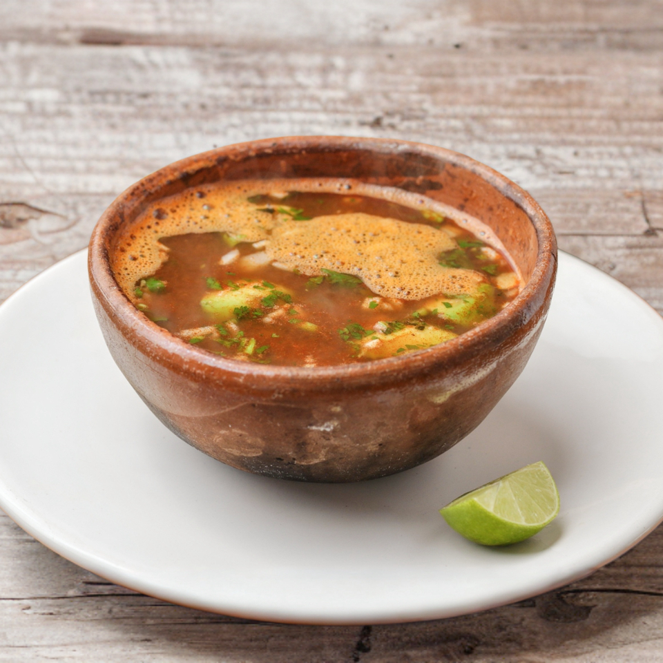 NOTA: No incluye camarones, solo es el sabor del consome. Con papa cocida, zanahoria cocida, almeja, cilantro, cebolla y aguacate. 16 onzas.