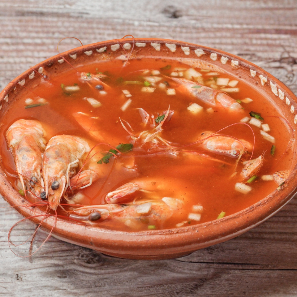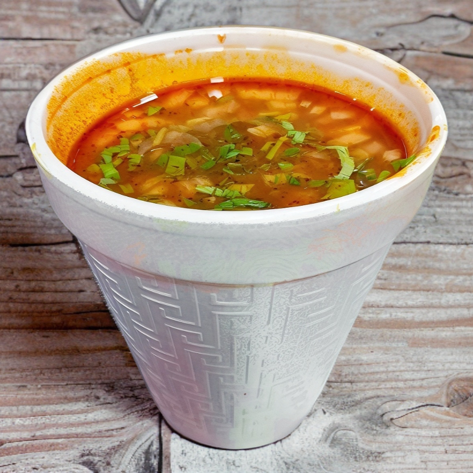 Nota: No incluye camarones, solo es el sabor del consome. Con cilantro, cebolla, aguacate, papa y zanahoria. 8 onzas.