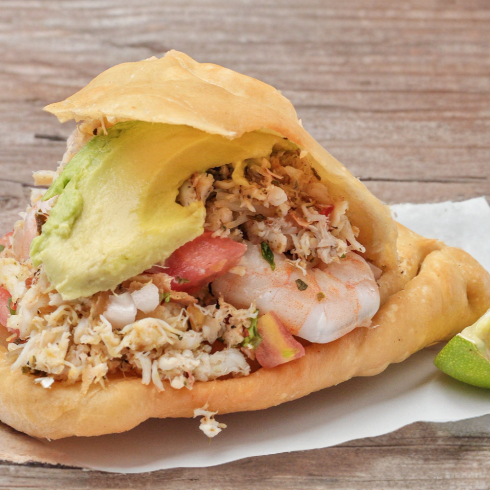 Empanada rellena de camaron, jaiba y pulpo, con cilantro, cebolla y aguacate.