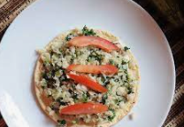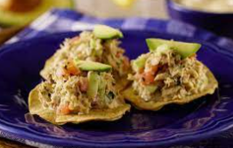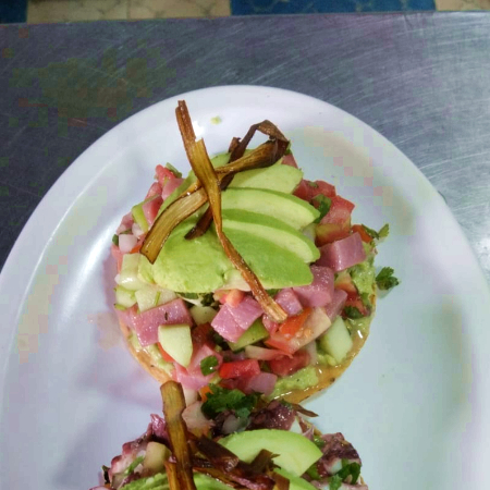 Con atún curtido, preparada con cilantro, cebolla morada, pepino y jitomate, se pone con 2 tostadas aparte para que no se remojen.