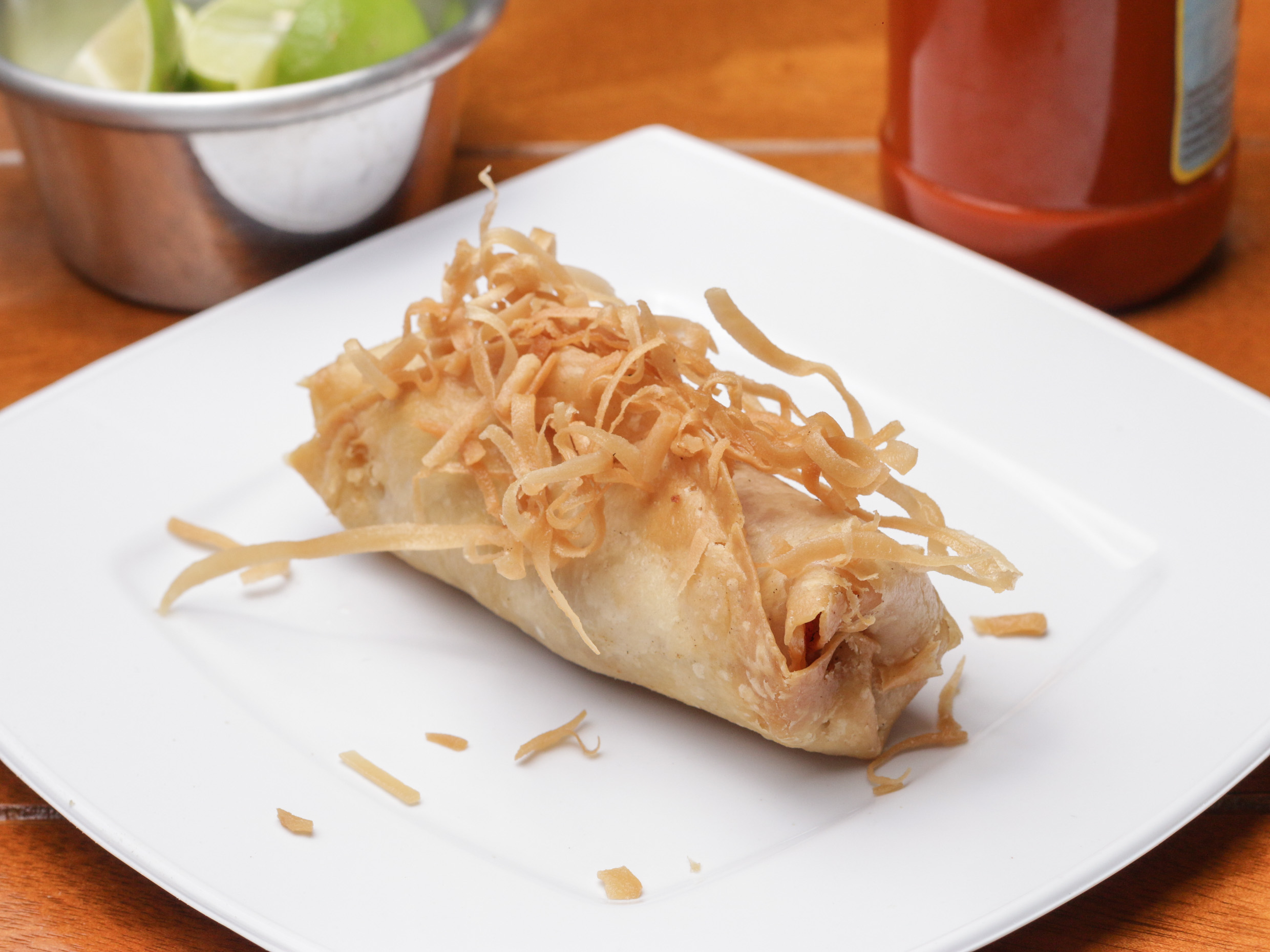 Rollito de tortilla de harina frita, relleno de camaron, queso y piña, con coquito rayado frito.