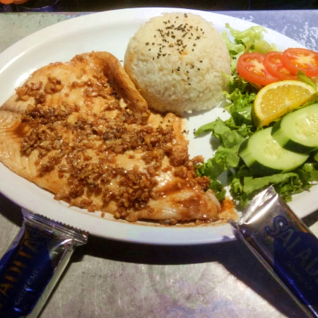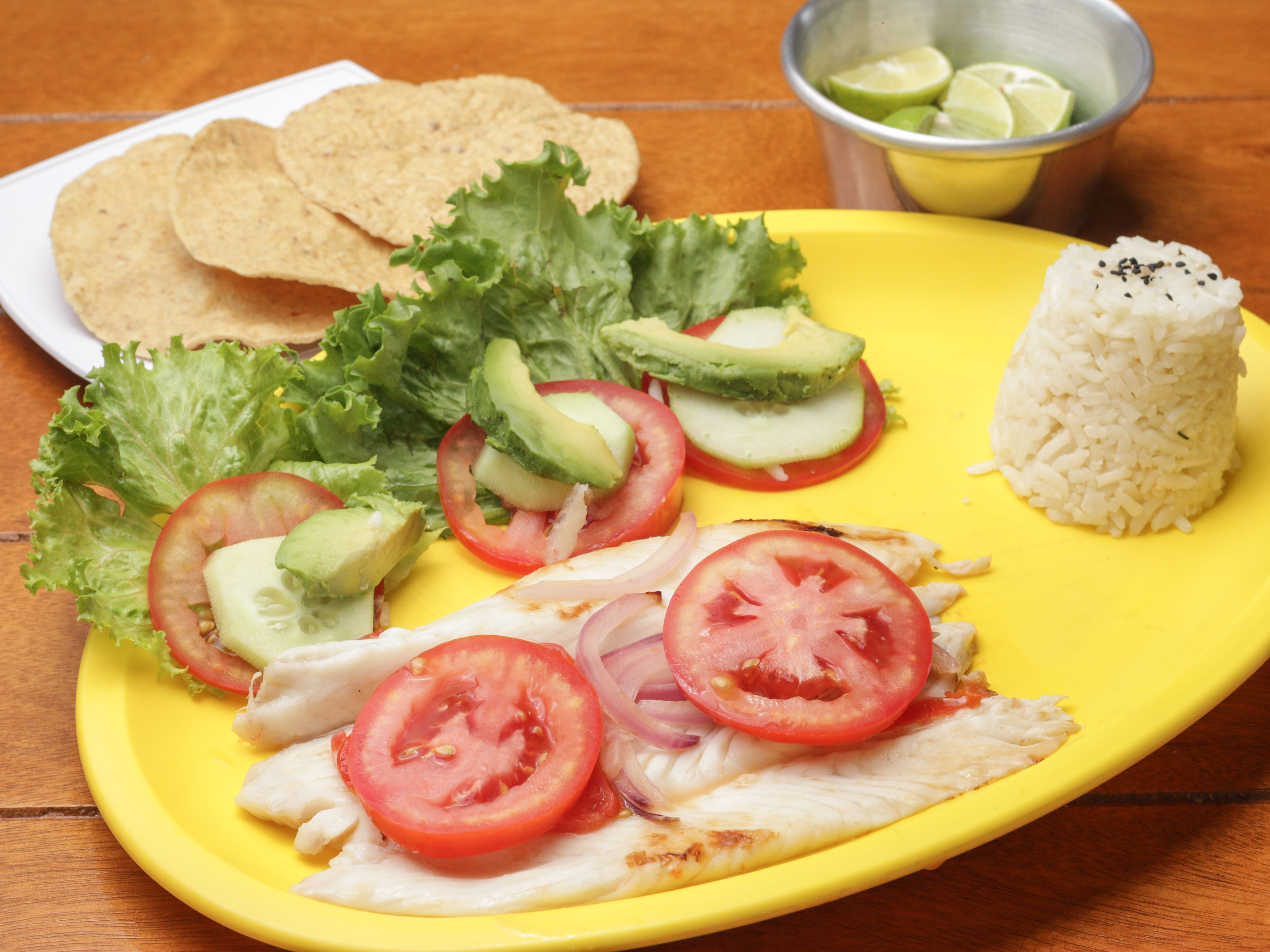 Filete de pescado de 180 gramos, con ajo y chile guajillo, acompañado con ensalada y arroz.
