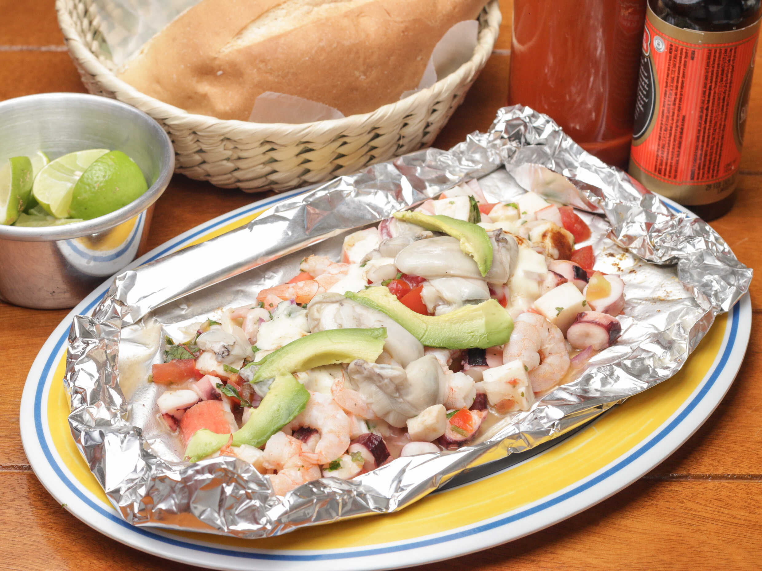 Caamaron, pulpo, calamar, surimi y ostion empapelados, sazonados, gratinados con queso.