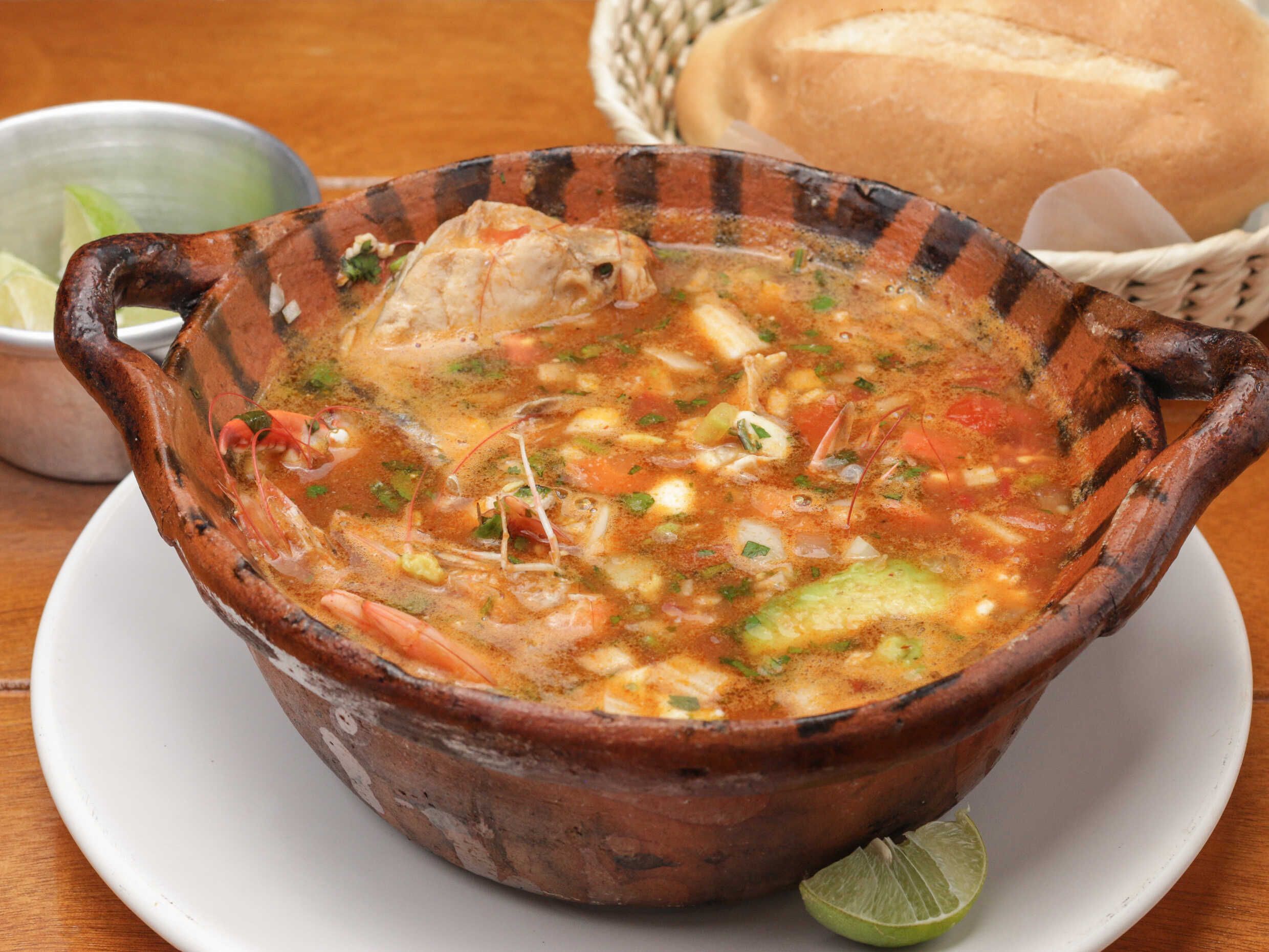 Camaron con pescado, acompañado de papa, zanahoria, almeja, cilantro, cebolla y aguacate.