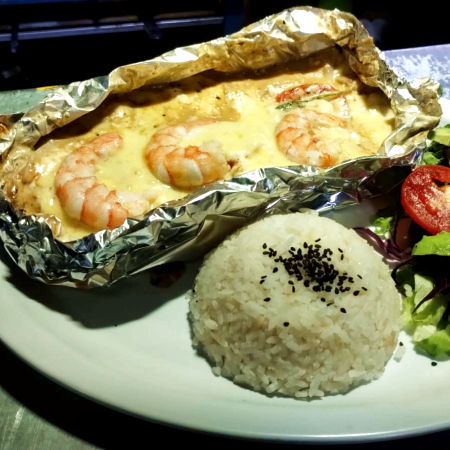 Filete de pescado empapelado con queso, mayonesa, chipotle, cebolla, jitomate, aguacate, jitomate y camarones, acompañado con ensalada y arroz.