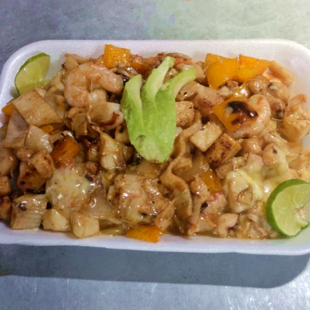 Camaron, pescado, ostion, calamar, pulpo, surimi, jaiba, papa cocida, zanahoria cocida, almeja, cilantro, cebolla y aguacate, todo gratinado en queso oaxaca. 60 onzas.