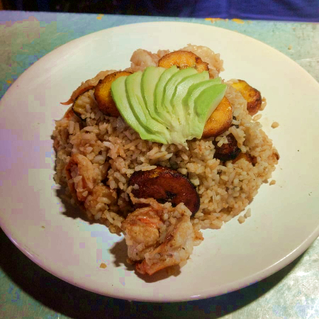 Camarones con arroz sazonado, acompañados de platano macho frito.