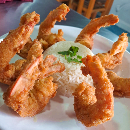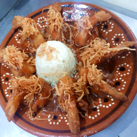 Orden de 250 gramos aproximadamente, camarones empanizados, acompañados de coco rayado y salsa de tamarindo, con guarnición de arroz.