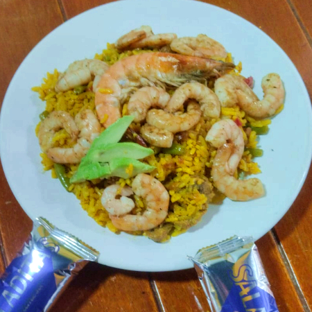 Orden de 900 gramos de paella, preparada con arroz, camaron, verduras, almejas y aguacate.