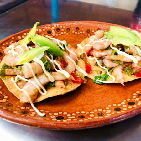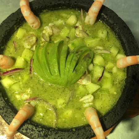 Con camarón curtido con limon, preparado con cebolla morada, pepino y aguacate