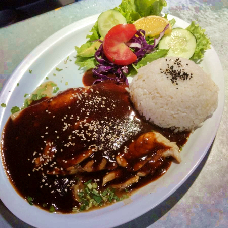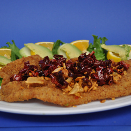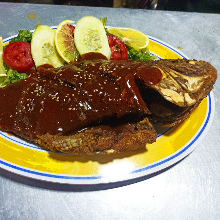 Filete de pescado de 180 gramos bañado con salsa agridulce de chipotle con toque de cátsup, acompañado de arroz y ensalada.