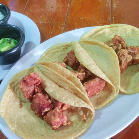 Orden de 3 tacos de chicharronde atún, acompañados de guacamole, cilantro, cebolla, aguacate y aderezo rosarito.