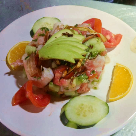 Con camaron cocido (el de los cocteles), preparado con limon, jitomate, pepino, cebolla morada, cilantro y aguacate.
