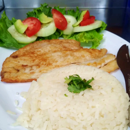 Filete de pescado de 180 gramos, acompañado con ensalada y arroz (porcion personal)