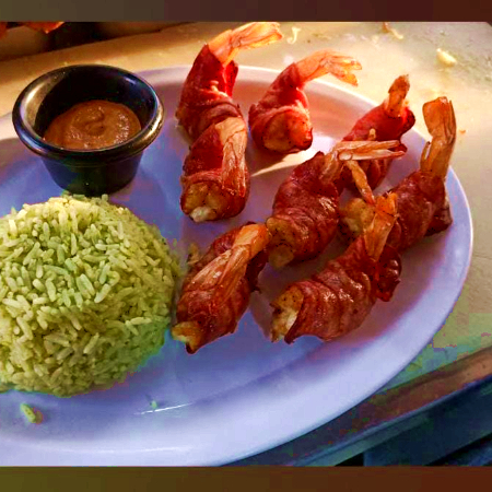 Camarones fritos, envueltos de tocino, rellenos de camarón, se acompañan con papas a la francesa y aderezo.