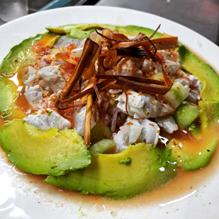 Ceviche de pescado curtido con limon, preparado con jitomate, pepino, cebolla morada, cilantro y aguacate.