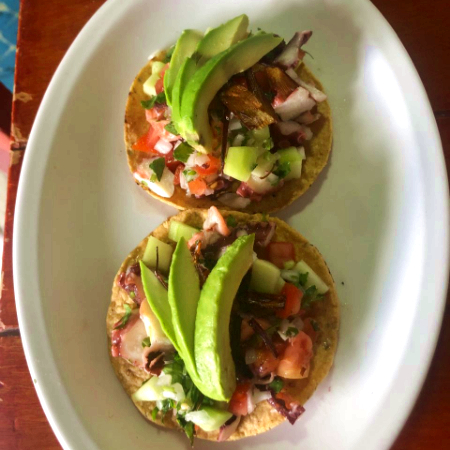 Orden de 3 tacos de pulpo con queso, acompañados de ensalada picada de lechuga, jitomate, cebolla y aguacate.