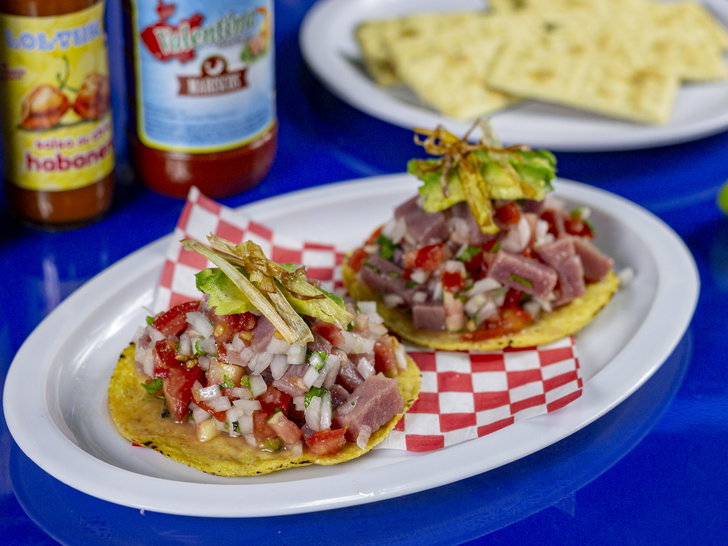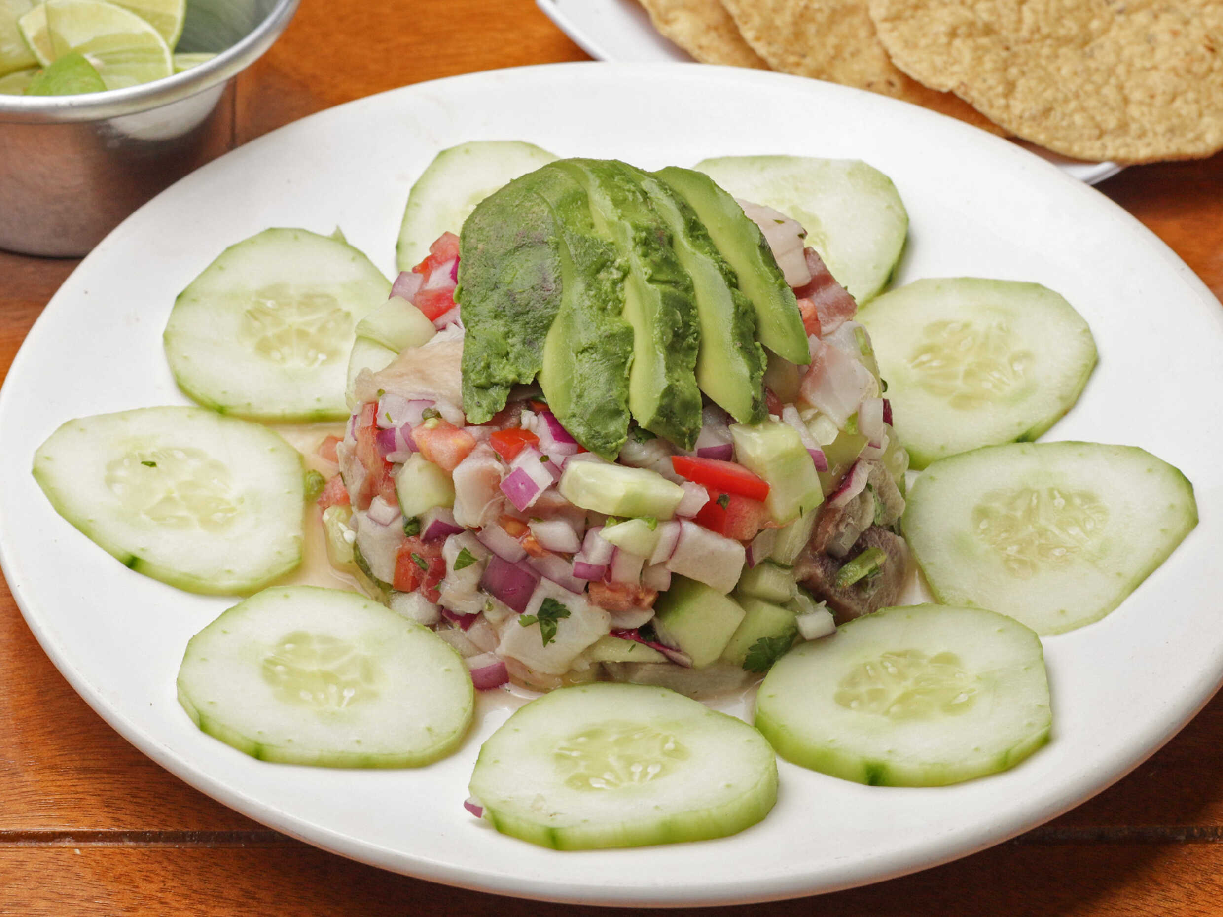 Pescado curtido con limon, preparado con jitomate, pepino, cebolla morada, cilantro, chile serrano picado y aguacate.