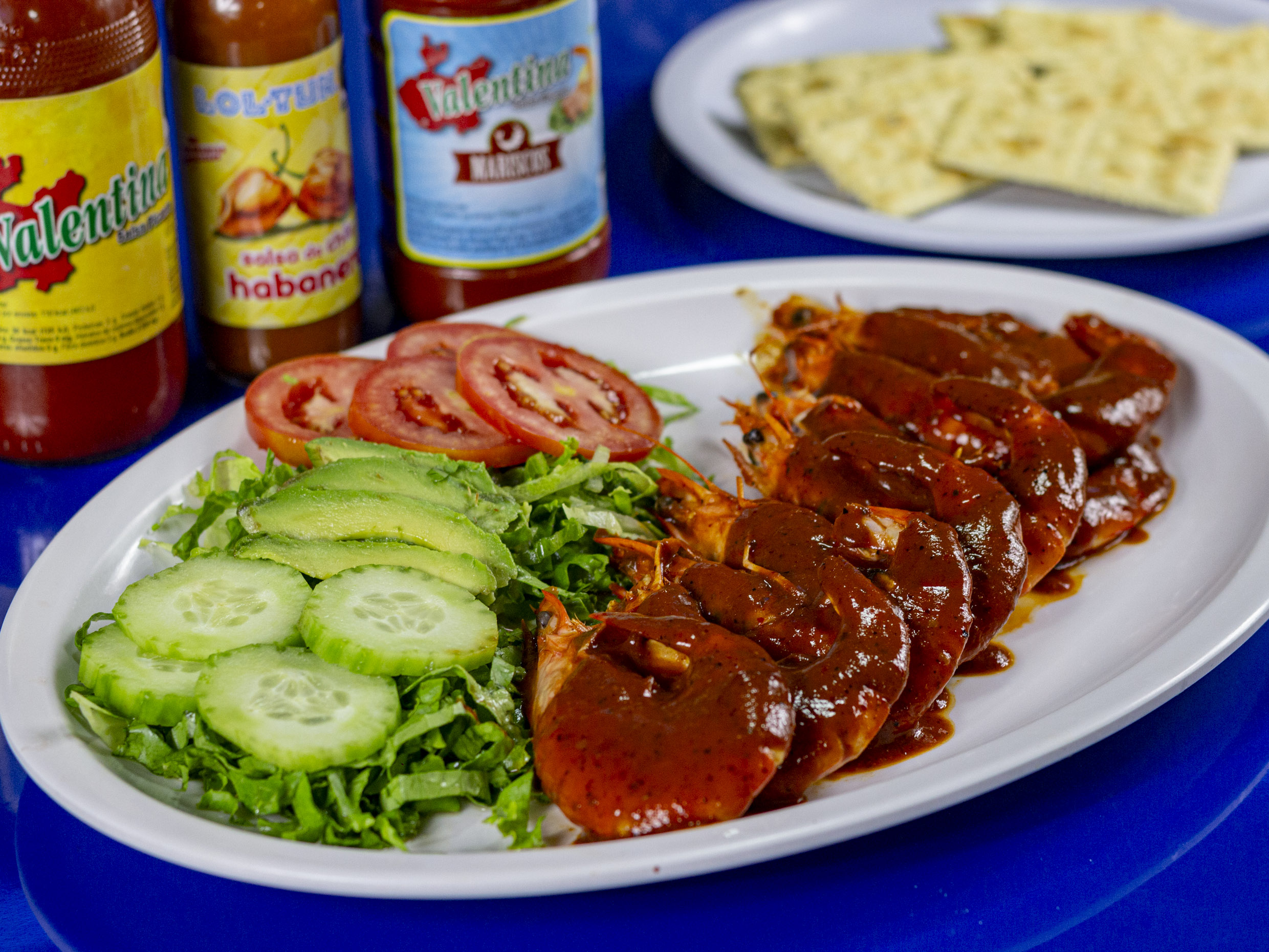 8 camarones grandes, salteados con mantequilla y bañados en salsa chipotle servidos con ensalada.