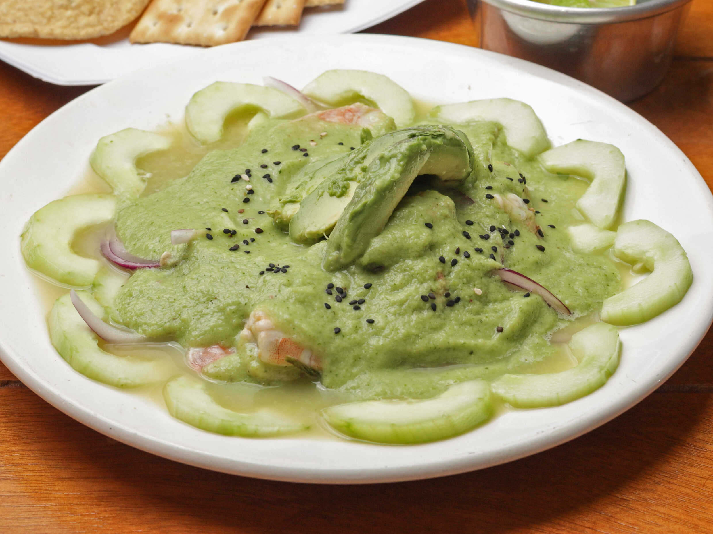 Ceviche preparado con limón, jitomate, aguacate, pepino, chile serrano, cilantro y cebolla morada.