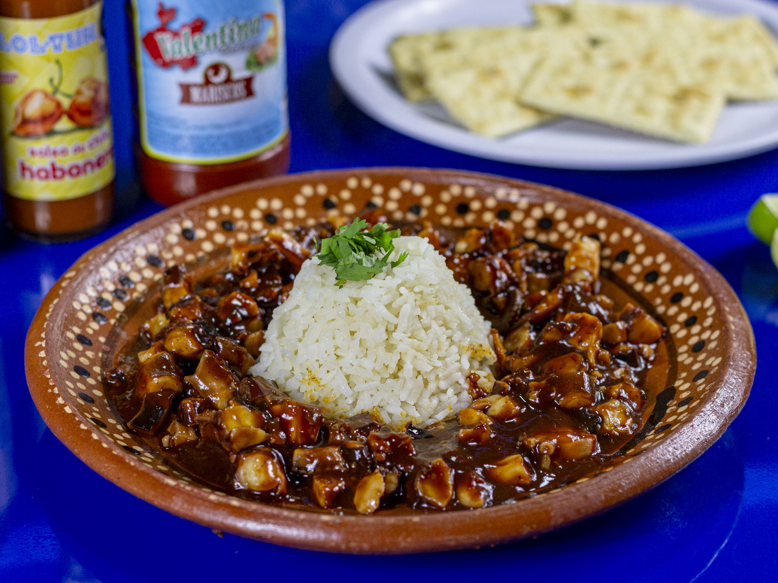 Trocitos de pulpo fresco recien cortado, salteados en mantequilla y bañados en salsa de chipotle, acompañado de una orden de arroz