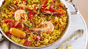 Pallea preparada con camarón de coctel, camarón cocido, pollo, carne de puerco, chistorra, ejote, chile morron, cebolla y almejas.