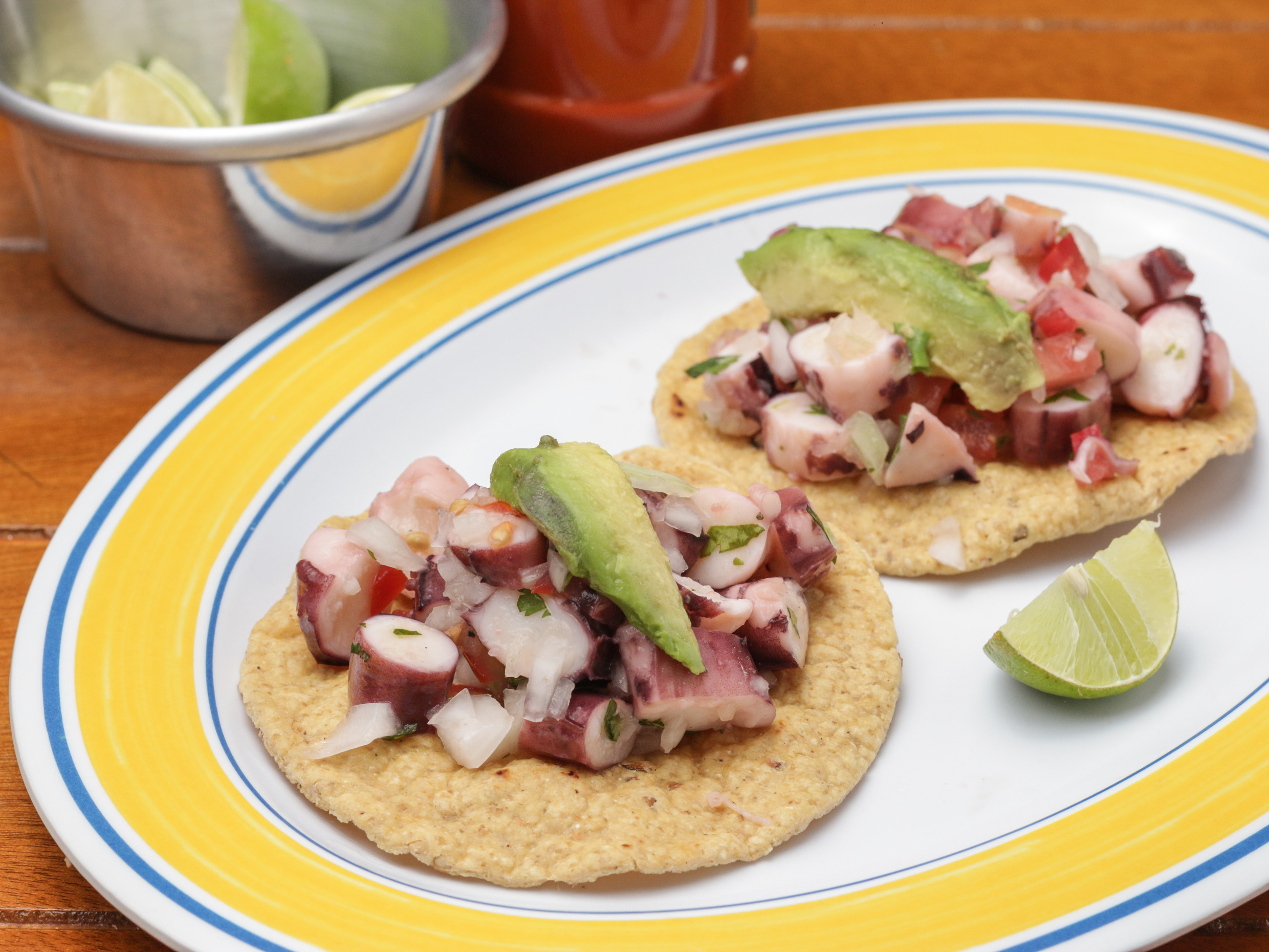 Trocitos de pulpo fresco cortados al momento servidos en frio con cebolla morada,jitomate, pepino,chile serrano, cilantro y mayonesa